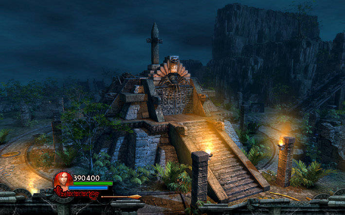 Auf der anderen Seite des Flusses liegt auf einer Säule der rote Schädel 6/10. Dann gehst du die rechte der zwei Treppen hinauf, läufst oder rollst schnell weiter, springst am Ende zur linken Brücke, und läufst weiter. Sprenge die Trucks 3 und 4, gehe weiter zu Truck 5 und 6, und erlege ein paar Moorhühner. Dort liegt bei einem Truck schwer erkennbar der rote Schädel 7/10. Hier kannst du in das erste Herausforderungsgrab gehen. Rolle die linke Kugel auf die dortige Druckplatte, dann rollst du die andere Kugel auf die Platte an der rechten Wand. Jetzt rollst du die erste Kugel vor, und nach rechts auf die Platte in der Mitte. Nun kannst du die Reliquie: Pfeil von Tezcatlipoca nehmen. Danach wieder hinaus gehen, und die Treppe hinauf. Nimm die Schrotflinte, und lege eine Bombe vor die rechte Faust am Tor. Gehe auf die Druckplatte, und zünde die Bombe, dann kannst du die Sonnenscheibe 1 nehmen. Jetzt gehst du links die Treppe hinunter, und beseitigst die Elche sowie Truck 7/10. Gehe weiter, auf die Brücke hinunter, und hole rechts oben mit Hilfe eines Speeres das Munitions-Upgrade. Dann geht es weiter über die Brücke. An der gefährlichen Grube wirfst du einen Speer in die Wand, und springst hinüber. Werfe noch einen Speer in die Wand, und hole oben das Artefakt Steinfeder. Dann geht es weiter, und du sprengst Truck 8/10. Gehe weiter, durch den Fluß, und hole den roten Schädel 8/10. Danach wirfst du zwei Speere in den Tempeleingang, einen von unten, und einen von oben vom Hügel aus, und holst den roten Schädel 9/10. Jetzt gehst du in den Tempel.