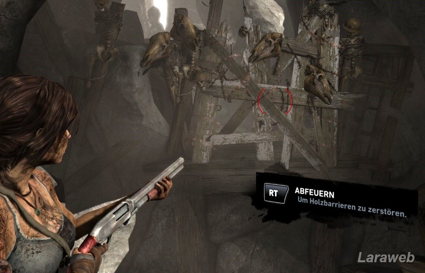 Finde einen Weg hinaus Hier habe ich gespeichert: Savegame 18 Du befindest dich nun in einer mißlichen Lage, und es sieht hier nicht sehr appetitlich aus. Nun mußt du langsam (!) mit links und rechts hin und her schwingen, bis die Aktionstaste gezeigt wird, die du dann schnell und dauernd hintereinander drücken mußt, bis sich Lara befreien kann. Watschle durch den Tunnel weiter, bis du ins Freie kommst, und am Ende die Schrotflinte findest, mit der man Holzbarrieren zerschießen kann, was du auch gleich mal machst. Gehe weiter, und springe zu dem Loch hinauf, wo du in eine Halle kommst. Hier gibt es natürlich wieder mal einen Kessel Buntes durch das Erscheinen von ein paar Heizkörperablesern. Durch meine schlauerweise voll aufgerüsteten Axt-Fähigkeiten (Axt-Experte) konnte ich alle beim zweiten Versuch mit je 3 Schlägen wieder heimschicken, und somit Munition sparen, ansonsten mußt du dir hier eine andere Taktik überlegen. Bei mir lag nachher noch einer oben auf einer Plattform, auf den habe ich einen Seilpfeil geschossen, dann fiel er runter, und ich konnte seine Wertsachen nehmen. Nun stellst du dich so hin, daß du einen Seilpfeil in die Glocke schießen kannst, und diese dann gegen die Tür schwingt, und sie öffnet. Watschle durch den Tunnel zum Tageslager: geschützte Nische. Wähle dann die neue Schrotflinte, und schieße dir den Ausgang frei. Wenn du hinaus gehst, steht Lara nach dem Video auf einer Kante. Bewege dich nach rechts weiter, und springe auf das Holzbrett, und dann vor an das nächste Brett, wo du dich extra festhalten mußt. Dort kletterst du oben durch das Loch in die Halle hinein. Hinweis: Tageslager => keine Schnellreise!