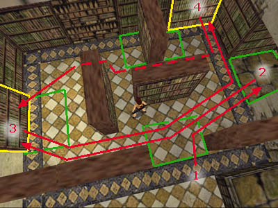 Die Bibliothek Die Bibliothek: hier besucht dich eine Wache und unten laufen zwei Kollegen herum. Auf der anderen Seite führt eine Treppe nach unten. Hier steigst du in die Fensteröffnung und kletterst hinauf, bis du ein Medipack findest. Dann geht es hinab in die Bibliothek, wo du die Wertsachen sammelst und am Tisch den „Steinhaufen-Schlüssel“. Interessant ist, daß bei jedem Computer eine Schachtel Tomb Raider steht, und natürlich die Zeichnung an der Tafel. Nun gehst du zu der großen Kiste in der Ecke, ziehst sie heraus und von der anderen Seite noch einmal, so daß du dahinter die Tür mit dem Brecheisen öffnen kannst. Dort ziehst du die erste Kiste vor, unter der Munition liegt, und dann die Kiste an der rechten Wand zweimal heraus (auf den flachen Kisten entlang). Dahinter findest du weitere Munition und ziehst die nächste Kiste auf die Stelle der Munition. Nun gehst du um die Ecke und schiebst die dortige Kiste einmal hinein, um darunter Geheimnis 2 (Medipack) zu finden. Nach soviel Arbeit ist es Zeit für Kultur. Gehe zu den Bücherregalen. Hier gehst du solange spazieren, bis sich eine Tür geöffnet hat, hinter der du zweimal Munition findest. Wenn du auf der Platte mit der zweiten Munition stehst, hörst du, wie sich nebenan der Ausgang öffnet. Wenn du allerdings dorthin gehst, wirst du einige Bodenplatten betreten, die ihn wieder schließen. Also ist etwas Übung erforderlich und du mußt teilweise springen. So erreichst du schließlich einen „radioaktiven“ Gang, wo dir oben ein Hund begegnet (savegame. 7). Nun gehst du noch vor dem Safe in die linke Ecke und hinauf, wo du im Fenster Munition und ein Medipack findest. Gehe zurück zum Safe und auf der linken Seite des grünen, radioaktiven Sumpfes hinauf.