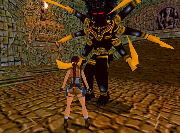 Die sechsarmige Shiva Nur mal so vorne weg und hinten drauf: gut, wie wir ja alle wissen, ist "Shiva" eine Art Gottheit mit vielen Armen, die man im heutigen Indien verorten könnte. Was er oder sie da so genau gemacht hat, oder heute noch macht, kriegt man selbst dann nicht raus, wenn man die entsprechende Wikipedia-Seite studiert. Laut einer anderen Beschreibung, die ich irgendwo anders gefunden habe, hält sich Shiva mit Nordic Walking und Energy Drinks fit. Und taucht gelegentlich in Computerspielen auf... Betrete den Raum mit dem sechsarmigen Säbelschwinger (bei älteren Programmversionen - tomb3.exe vor 12.98 - ohne entsprechenden Patch darf hier nicht gespeichert werden, was sowieso nicht nötig ist, da Säbelschwinger schläft, außerdem empfehle ich in diesem Fall den TR3-Patch von Eidos zu laden). Links von ihm liegt Munition (oder ein Gewehr). Ziehe dann den Block rechts von ihm vor. Er unterscheidet sich wie alle weiteren verschiebbaren Blöcke bei genauer Betrachtung dadurch, daß er in vier Teile unterteilt ist, also quasi ein Kreuz trägt. Dadurch findest du Munition und den Ausgang. Hier wartet ein(e) weitere Shiva, die aber dummerweise aufwacht. Laufe nach rechts auf die Mauer und schieße auf sie, bis sie sich mit den Säbeln schützt. Beachte die Tür mit den beiden Schlössern, für die du die Schlüssel noch suchen mußt. Den grünen Kristall 2 kannst du dir auch für eine spätere "Heilung" aufheben, da du hier noch ein paar mal vorbeikommst. Jetzt kannst du die beiden Hebel betätigen und nach links unten in die geöffnete Tür laufen, wo du aus sicherer Deckung feuern kannst. Springe dann in dieser Halle in das Bodenloch und betätige den Hebel. Sicher hast du bemerkt, daß sich der Block daneben schieben läßt. Das ist Geheimnis 1. Krieche hinein (wegen den Pfeilen) und hole aus der Grube das Medipack, springe aber sofort wieder heraus. Krieche dann nach nebenan und hole die anderen Wertsachen. Jetzt geht es zurück in die Halle und in die neue Tür bei dem Bodenloch. Springe mit Anlauf in den Sumpf und gehe nach links, wo du dich herausziehen kannst. SG3 Springe vom Abhang auf die nächste Etage, drehe dich um und von dort mit Anlauf/Griff in den höheren Gang mit einem Affen und einem Medipack. Drücke den Hebel und gehe seitlich nach links, bis du vor der Tür stehst. Laufe los (genau in der Mitte des Ganges laufen!), springe über das Messer und hänge noch einen Spurt an, um den Gang des Todes halbwegs heil zu überstehen. Erfolg: "Aichmophobie" = Lass dich nicht von den Stachelwänden und -decken in Indien verletzen. Diesen Gang inklusive Messer absolut unverletzt zu durchqueren ist nicht jedermanns (frau) Sache! Und es kommen noch weitere happige Stachelwände! In der PC-Version kannst du hier vorher abspeichern (Savegame), und mit dem Savegame-Editor (siehe unten) zum Ende des Levels "gehen", dann ploppt dieser Erfolg auf! Raum mit Unterwasserlabyrinth Auf der anderen Seite warten zwei Affen. SG4 Ziehe rechts den Block hervor und schiebe ihn zum Käfig auf der Seite beim Eingang. Klettere auf den Käfig und springe auf der anderen Seite nach oben zu der Leiter, die zu Geheimnis 2 führt. Sammle die Munition und drücke den Hebel, dann geht es wieder hinunter. Betätige den Hebel auf der Rückseite des Käfigs und schiebe den Block auf die andere Seite des Käfigs, um nach oben zu dem geöffneten Gitter zu gelangen. Springe hinab und ziehe am Unterwasserhebel, um das Gitter zu öffnen. Atme tief durch und tauche hinein, betätige links und rechts die Hebel und kehre wieder zum Luft holen zurück. Tauche dann in dem engen Tunnelstück nach oben in die neue Öffnung. Springe dort ins Wasser, ziehe den Hebel auf der Seite beim Eingang, mache eine Rolle und tauche schnell durch die Tür auf der anderen Seite, wo am Ende der Kammer Geheimnis 3 mit drei verschiedenen Wertsachen liegt. Ziehe dann die beiden anderen Hebel, um so über dem Wasser drei fast durchsichtige Blöcke hervorzuzaubern. Über diese (Achtung Feuer) erreichst du auf der anderen Seite den Hebel oben an dem Pfeiler. Drücke ihn, laufe nach links, und zwar so, daß du auf dem Steg landest und nicht im Wasser, und dann schnell in die Tür, bevor sie sich wieder schließt (den grünen Kristall 3 würde ich erst nach der folgenden Dornenwand nehmen). Gehe in dem Gang nach rechts zu dem Hebel. Drücke ihn (die Dornenwand wird aktiviert) und spurte zum anderen Ende, mache eine Rolle, einen Schritt vor, hebe den Schlüssel 1 auf und laufe wieder hinaus in die Halle. Gehe noch mal zurück, denn dort, wo die Dornenwand herkam, liegen Wertsachen. Jetzt ist Gelegenheit für den grünen Kristall. Stelle dich dann ganz rechts an der Wand vor den Sumpf, springe mit Anlauf hinein und gehe an der Wand entlang zur anderen Seite, wo du heraus steigst. SG5 Laufe und springe bis oben, wo rechts ein Gang beginnt, dem du bis zu einer Abzweigung folgst. Nimm zuerst links die Fackeln und gehe rückwärts die Stufen hinauf. Sobald du hörst, wie die Kugel losdonnert, läufst du wieder zurück in den vorherigen Gang. Dann geht es die Treppe hinauf und zu zwei Türen, die sich automatisch öffnen. Nimm die rechte und drücke am Ende (Vorsicht Affe) des Ganges den Hebel für die Tür, die dich (zwei Affen und ein Medi) in eine Halle mit Kristall 4 bringt. Links kannst du in dem Loch hinunterklettern und landest wieder vor dem Tor mit den Schlössern. Jetzt fehlt nur noch der andere Schlüssel. Halle mit einem leeren Wasserbecken SG6 Gehe nach links in den Gang, klettere über einen Block und betrete eine Halle mit zwei Affen und einem trockengelegten Becken. Den Hebel darin kannst du erst ziehen, wenn es geflutet ist. Also weiter in den nächsten Raum, wo du geradewegs zu dem Hebel tauchst und ihn ziehst. Wenn du genau zwischen dem feurigen Atem der Statuen bleibst, dürfte nichts passieren. Springe mit einem Salto zurück ins Wasser und tauche unter dem Hebel in den Gang, halte dich aber wegen der Giftpfeile auf der re