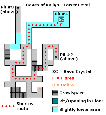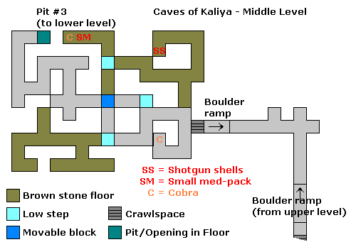 In diesem Level gibt es einen kurzen und einen langen, gefährlichen Weg. Der gefährliche Weg bringt zusätzlich nur ein kleines Medipack sowie etwas Gewehrmunition ein, außerdem sind keine Geheimnisse versteckt. SG0 Den kurzen Weg natürlich nur nehmen, wenn man es eilig hat, oder die Erfolge schon hat, oder nicht will. Karte des Labyrinths siehe unten! Kurzer Weg: gehe nach links und folge dem Gang bis zur Kreuzung, an der du links abbiegst und dich immer links hältst, bis du eine Grube findest, in die du dich bis ganz unten (zwei mal) herabläßt und Fackeln findest. Klettere wieder nach oben und folge dem Gang weiter, also nach links, wo gleich rechts um die Ecke ein Kriechtunnel ist, in dem du nach links kriechst und dann gleich in den nächsten Kriechtunnel direkt vor dir. Hier kriechst du nach rechts zu Uzi-Munition, dann geradeaus rückwärts und läßt dich vorsichtig in die Grube hinab. Dort folgst du dem Gang bis zum nächsten Kriechtunnel, in dem du nach links abbiegst und dann immer an der rechten Wand entlang marschierst, bis du in einer Kammer mit dem grünen Kristall 1 landest... (siehe nächster Absatz) Langer Weg: Oberste Ebene - Upper Level (bei Stella) Hierbei ist es äußerst ratsam, sich eine Skizze (siehe unten oder bei Stella) anzufertigen, denn du mußt wie beim kurzen Weg die Fackeln und die Uzi-Munition holen. Dann darfst du dich aber nicht in die Grube bei der Uzi-Munition herablassen, sondern mußt wieder zum Beginn des Levels zurückkehren, was fast nur mit Karte funktioniert. Und du mußt noch die Schlange 1 erlegen, das ist auf der Karte von Stella das C = Cobra. Dann geht es vom Startpunkt aus (Enter Level) in den anderen Gang, wo du nach etwas kriechen eine große Schräge findest. Nun kommt der gefährliche Teil: laufe hinunter und spurte nach links in den Gang. Hier gehst du rückwärts die Schräge hinauf und läufst beim Ertönen des Kugelgeräuschs in die erste Nische links. Zweite Ebene - Second Level (bei Stella) Dann geht es die Schräge hinauf und durch einen Kriechgang. Links ist eine Sackgasse mit Schlange 2. Zurück und nach dem Kriechgang rechts gehen (schau einfach auf die Karte), wo du im ersten Gang rechts Munition findest und im anderen Gang das Medipack sowie die Schlange 3. Hier findest du (in der Nähe) auch einen Block (movable block), den du einmal schiebst und so in dem Gang rechts schließlich eine Grube erreichst, in die du dich herabläßt. Dritte Ebene - Third Level (bei Stella) Du kommst auf der Karte von Stella links oben bei dem Punkt: Pit # 3 heraus. Navigiere jetzt mittels Stellas Karte zu Schlange 4 und dann nach rechts oben zu dem Punkt Pit # 4, das ist die Kammer mit dem grünen Kristall 1... Unterste Ebene - Lowest Level (bei Stella) Kammer mit grünem Kristall 1: SG1 nimm die Fackeln und springe über die Grube, um den Kristall zu ergattern. Werfe dann von der Wand aus eine frische Fackel hinunter (zweimal Komma) und betrachte dir die Lage. Unten liegen vier Schlangen in den Ecken. Lasse dich hinunter und gehe sofort einen Schritt zurück in die Mitte. Von hier aus kannst du die ersten vier Tierchen erlegen. Nachdem du mit einer weiteren Fackel die Lage erkundet hast, springst du von der Wand her in die Rollbahn der Kugel Richtung Ausgang und gleich wieder zurück an die Wand. Vor dem Ausgang dösen übrigens 6 weitere Schlangen. SG2 Gehe und krieche bis zur nächsten Rampe mit Kristall 2 und Medipack davor. Ziehe schwere Waffen und rutsche hinunter... SG3