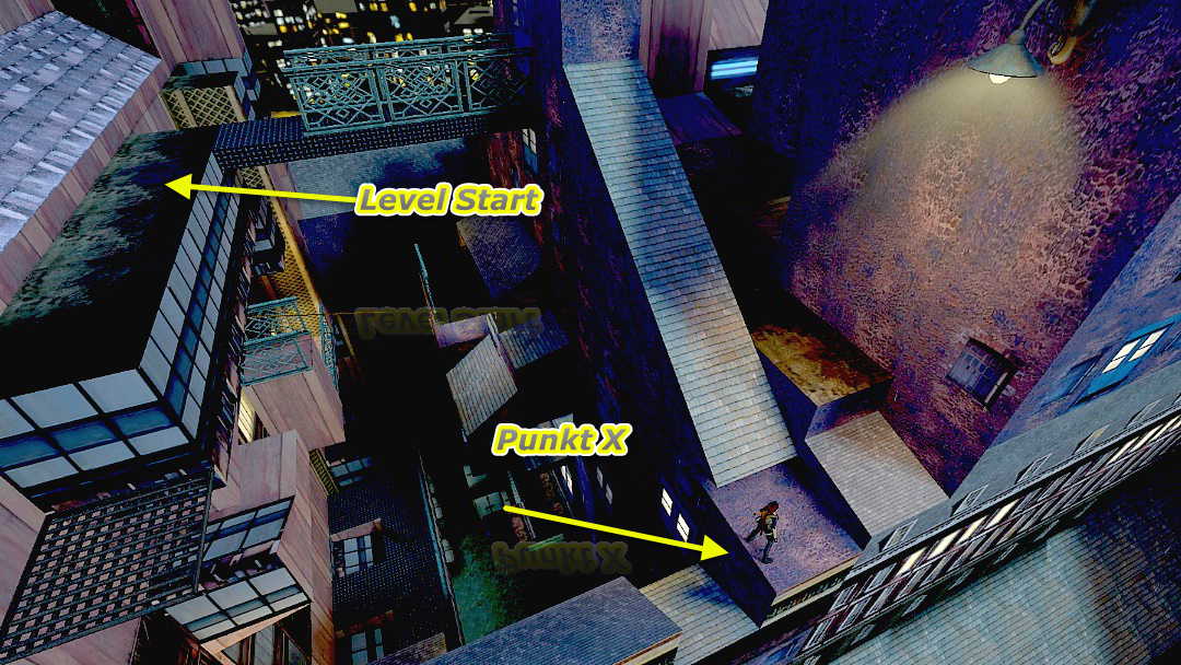 Die neuen TR 3 Remastered Erfolge, die man hier (in diesem Level) kriegen kann, stehen nun in der folgenden Lösung, die restlichen Erfolge stehen hier. F5 drücken zum Aktualisieren dieser Seite, die letzte Aktualisierung (Datum) steht rechts unten. Zeitspiel: Speedrun (Level möglichst schnell abschließen) Tomb Raider Remastered Steuerung. Worum geht's? Kennst du den Film: "Die Katze auf dem heißen Blechdach"? Jedenfalls wirst du jetzt über die Dächer Londons turnen, und einige geheimnisvolle Gebäude erkunden, bis du schließlich in der berühmten St Paul’s Cathedral landest... Erfolg: "Fliegender Fuchs" = Benutze alle Seilbahnen (4 von 6). Erfolg: "Ich bin einfach von hier" = Schließe das Level "Kai an der Themse" in unter 1 Minute ab. Das sollte klappen, im Link gibt es genügend Videos und Erklärungen... Anmerkung: es gibt hier am Beginn des Levels drei verschiedene Wege (Routen), die ersten beiden kurzen Wege führen dich wieder zum Beginn des Levels, dann nimmst du den dritten langen Weg, um ins nächste Level zu gelangen. Erste Route: (einfach geradeaus hinunter) SG0 Springe hinunter auf das Gitter vor dir. Drehe dich um und hänge dich an die Kante des Gitters, lasse los und springe sofort nach vorn, um auf einem Vordach zu landen. Hier verscheuchst du eine Krähe und drückst den Schalter. Springe dann hoch und halte dich an dem Gitter über dir fest, um zu dem Balkon mit der Seilbahn zu hangeln, die dich zum anderen Haus bringt und du auf ein Dach fällst, an dessen Kante du dich festhältst. Lasse los und greife sofort den Spalt darunter, hangle nach rechts und ziehe dich hoch. Hier hast du es mit einem unfreundlichen und bewaffneten Hausbewohner zu tun (laufe schießend an ihm vorbei und mache eine Rolle), der dir sein Medipack schenkt. Drücke den Schalter und gehe auf der anderen Seite des Hauses an die Kante zum Abgrund. Springe auf den Vorsprung vor dir und erlege zwei Ratten gegenüber. Die braune zweite Hälfte des Vorsprungs ist übrigens von der bekannt beliebten morschen Art. Es ist besser, wenn du sie mit einem Schritt vor und sofortigem zurücklaufen zum Einsturz bringst. Von der rechten Ecke des Vorsprungs springst du dann mit Anlauf/Griff knapp an dem Mauerstück vorbei zu dem Rattensteg und gehst in den Gang. Hinten um die Ecke lauert dort ein Schütze, den du vorsichtig anlockst und schießend rückwärts den Gang entlang bis draußen flüchtest, um seinen Kugeln zu entgehen. Er hat den Schlüssel zum Belüftungsraum dabei. SG1 Lasse dich dann vom Rattensteg auf das erste darunterliegende Gitter hinab, wo du den Schalter drückst. Jetzt läßt du dich auf das nächste Gitter hinab, um kriechend Harpunen zu holen, und dann hinunter in den Hof. Hier findest du Fackeln, ein Medipack und hinter der Mauer in der Ecke den grünen Kristall 1. Drücke dann den Schalter bei der "Leiter", um auf ihr wieder auf den Rattensteg zu steigen, von dem du dich wieder auf das Gitter mit den Harpunen von vorhin herabläßt. Dort springst du mit Anlauf/Griff zu dem abgeschrägten Mauervorsprung (tiefere Seite anvisieren) und ziehst dich hoch. Jetzt kannst du dich wieder auf den Steg hochziehen, auf dem du hergekommen bist. Auf der anderen Seite (mit der Seilbahn) läßt du dich durch die grüne geöffnete Falltür auf den unteren Steg hinab. Hier mußt du eine Krähe verscheuchen und siehst oben in der Mauer einige Nischen. Zwei davon kannst du vom Steg aus erreichen. Springe zu der linken hoch, krieche hinein und den langen Tunnel weiter zur anderen Häuserfront. Hier findest du gegenüber einen Schalter, den du drückst und dann wieder zur anderen Hausseite zurückkriechst. Jetzt ist die rechte Nische dran. Ziehe dich hoch (und lasse wieder los, falls du eine Krähe angelockt hast), hangle nach rechts in die nächste Nische, um dort Munition zu holen, und dann weiter in die letzte Nische zu Geheimnis 1*. Kehre anschließend auf den Steg zurück. Am anderen Ende des Stegs siehst du unten ein schräges Dach, auf das du dich herabläßt und die Kante greifst, um den Sturz zu mildern. Auf der anderen Seite des Hofs lauert übrigens ein Schütze, nach dessem tragischen Ableben du bei ihm einen grünen Kristall 2 und Fackeln findest, in der anderen Ecke liegt Uzi-Futter. Dort kletterst du auf die höchste Kiste und springst mit Griff zu dem darüberliegenden Mauervorsprung. Steige dann die Leiter hinauf. Auf diesem Steg liegt um die Ecke eine weitere Leiter, die zu einer dritten führt, die dich nach ganz oben bringt. Jetzt kannst du mit Anlauf zurück zum Beginn des Levels springen.