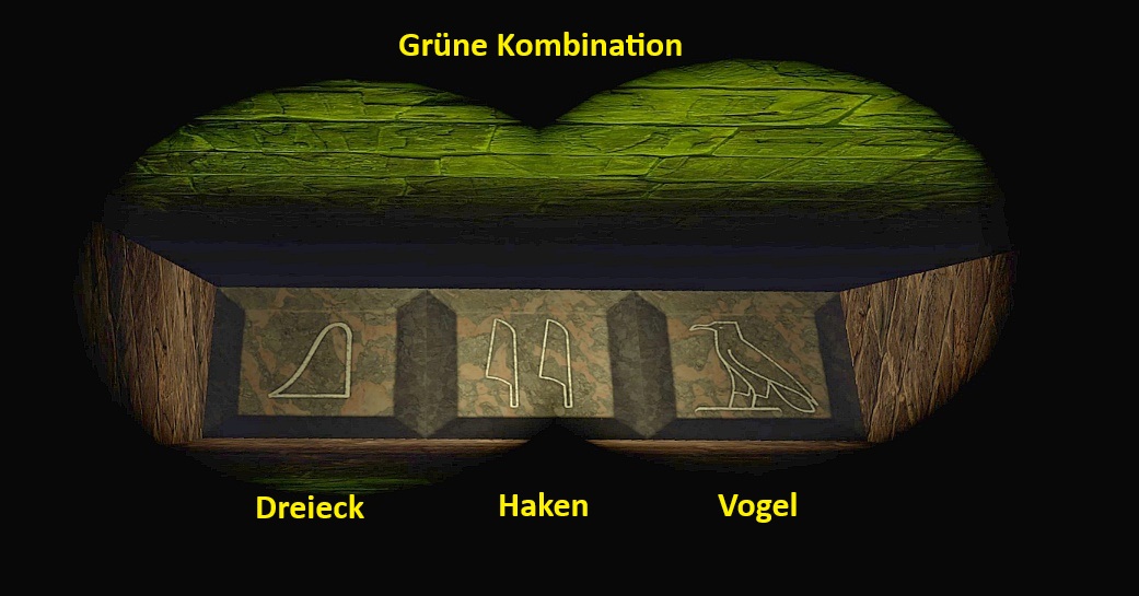 aber es ist irgendwas mit Ochse. Erfolg: "Dicke Luft" = Gehe durch den Fallenkorridor, ohne Schaden zu erleiden. Dieser Erfolg heißt jetzt in der englischen Version "IAQ", weil du die drei Schalter bzw. Wandplatten in der Reihenfolge IAQ drücken mußt, was "2 Haken" (also halt das Ding, wo zwei sind) - Vogel - Dreieck (also halt das, was es nur einmal gibt, und kein Vogel ist) bedeuten tutet, und dann geht rechts hinten (vom Levelbeginn aus gesehen) das Gitter auf, und das ist ein Fallengang, wo du am Ende den Hebel ziehen und wieder zurück watscheln mußt, damit du die Schalter wieder "auf Null stellen" kannst. Und wenn du dabei keinen Schaden erleidest, wäre das prima, weil dann der Erfolg aufploppen tut. Dieser Fallengang ist übrigens nicht besonders kompliziert, du kannst links oder rechts gehen, das ist egal, am Ende (hinten) ist der Schalter, und dann geht es wieder zurück. SG5 Gehe weiter und in die Halle mit den beiden Bergziegen. Links und rechts beim Eingang sind Käfige, in die du sie eine nach der anderen locken mußt und mit dem Hebel einsperrst, was etwas Übung und Mut erfordert (stelle dich im Käfig neben das Gitter, warte bis das Vieh drin ist und laufe um die Ecke zum Hebel). Die Tierchen müssen leider aufgeweckt und eingesperrt werden, sonst gibt es später Probleme. Bei dem abgemagerten Kollegen liegen Fackeln und ein Papierfetzen, der uns das ägyptische Alphabet (!?!) zeigt. SG6 Nun geht es zu den drei Steinplatten, die (laut Papierfetzen) mit I, Q und A beschriftet sind, womit der Fall natürlich sonnenklar ist!?! Jedenfalls (Versuch macht kluch) drückst du sie in der Reihenfolge rechts (Vogel), links (Haken), Mitte (Dreieck), wodurch sich links (Westen) ein Gitter öffnet. Dahinter springst du mit Anlauf und gezogenen Waffen (Fledermäuse) über die Grube und ebenso über die nächste, um einen Gang zu erreichen. Hier sind vier farbig leuchtende Öffnungen in der Decke. Schaue mit dem „beleuchteten“ Fernglas hinein und notiere dir zu jeder Farbe die Zeichenkombination. Anschließend geht es wieder zurück zu den Steinplatten. Du kannst nun die vier Kombinationen in beliebiger Reihenfolge drücken und die entsprechenden Bereiche besuchen, allerdings darfst du nicht versehentlich eine andere Kombination einstellen (wichtig!), dann würde ich das Level noch mal von vorn beginnen. Hinweis: wenn du eine "falsche" Kombination drückst, mußt du durch den oben erwähnten Fallengang, und damit die Schalter wieder auf Null stellen.