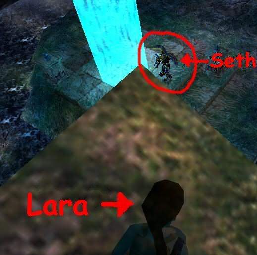 Hier hast du einen wunderschönen Ausblick über die Höhle (savegame.0) und springst mit Anlauf nach rechts bzw. links, wenn du zur Höhle blickst (also nach Norden), um sicher im Wasser zu landen. Dort kannst du auch an einer Stelle auf die mittlere Insel klettern. SG2 Bevor es nun weiter geht, solltest du vorsichtshalber ausprobieren, wie du zu der Rampe und der Tür links von der Statue (im Süden) kommst, da es nachher schnell gehen muß, denn jetzt neigt sich das „Spiel“ dem nicht gerade einfachen Ende zu und du wirst tonnenweise Medipacks brauchen! Originale Version: Lara kann hier übrigens aufgrund eines Programmfehlers keine Fackeln benutzen oder das Fernglas mit Beleuchtung. Gefunden von larafan: im letzten kampf mit seth, da funktionieren meine fackeln erst nachdem seth aktiv ist. du schreibst deine fackeln funktionieren überhaupt nicht. larafan