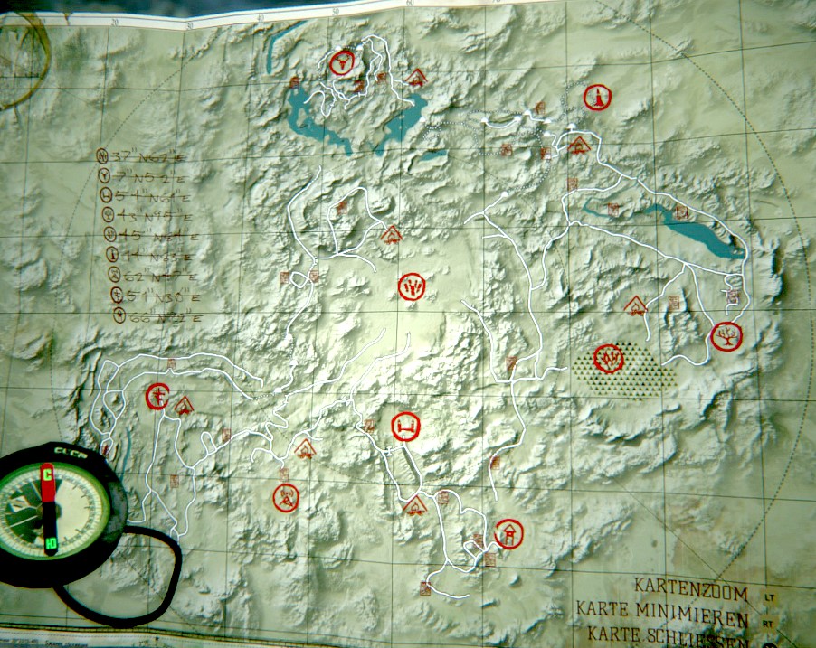 Karte: Links ist die gesamte Karte, mit allen Einträgen, danach kommen die vier Teile der gesamten Karte (sozusagen vergrößert). Und noch die Koordinaten. Klicken zum vergrößern! Errungenschaften (20):