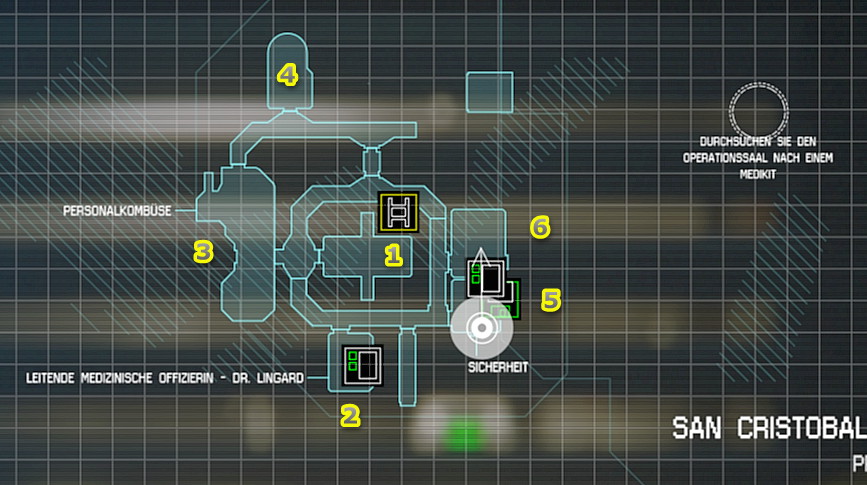 Nach dem Schacht landest du in einem Raum, wo du dich erst mal im Schrank versteckst. Wenn die Luft rein ist, das hört man ja quasi, watschelst du aus dem Raum hinaus, und gleich links weiter in den Gang, wo du rechts gleich in das Büro von Frau Doktor Gundula Lingard kommst. Da kannst du dich erst mal unter dem Tisch verstecken. Du kannst hier deine Karte aktualisieren, und den PC einschalten, wo du im letzten Ordner ein Video von Frau Doktor anschauen kannst, die Gute sieht reichlich mitgenommen aus! Das aktualisiert auch dein Ziel. Anschließend gehst du nach links hinaus, weil wenn du im Gang rechts gehst, kommt ein Feuerchen! Also links lang, am Dahingeschlichenen vorbei, und in die Personalkombüse getrabt, man hat ja auch mal Hunger! Es gibt hier Versteckschränke, und schau auf deine Karte. Du kannst hier den schmalen Gang weiter zur Dusche (Hygiene Area) gehen, in der Zeug liegt, jedenfalls mußt du letztendlich in den Raum, der auf der Karte mit "Sicherheit" (Security Desk) bezeichnet ist. Hier ist ein Versteckschrank, ein Speichertelefon, ein PC, und neben dem PC der Bauplan Molotow-Cocktail, den man leicht übersehen kann! Am PC findest du in einem Ordner den benötigten Code 2505, und diesen gibst du gleich rechts ein, und kannst dort die Schlüsselkarte nehmen. Leider reicht es nicht, daß du diesen Code jetzt schon kennst, du mußt ihn erst am PC anschauen! Speichere nun nochmal ab! Jetzt mußt du in den Raum nebenan von diesem Raum, wo du jetzt die Tür mit deiner Schlüsselkarte öffnen kannst. Klicken zum vergrößern! Achtung: es gibt hier natürlich noch mehr Räume, als auf meiner Karte zu sehen sind. Das ist jetzt nur mal der prinzipielle Weg! Hinweis: in dem nun folgenden großen runden Gang ist rechts auf der Karte gesehen noch der Raum "Notaufnahme". Hier stehen aber drei Leute drin, die eventuell auf dich schießen, jedoch es gibt hier auch den PC mit dem Archiv-Log 051 bis ca.056. Auf der Karte gesehen links unterhalb im Gang vor der Notaufnahme gibt es auch noch einen Nebenraum mit der Ausweiskarte A. Sawers, also da, wo auf meiner Karte "Bett" steht, geht gleich rechts in der Nähe eine Tür rein zu diesem Nebenraum, der jetzt noch nicht auf meiner Karte zu sehen ist. Wenn du da bei "Bett" den Hauptgang nach rechts weiter gehst, kommst du in diesen besagten Raum "Notaufnahme", der jetzt ebenfalls noch nicht auf meiner Karte verzeichnet ist. Achtung! In den Raum Notaufnahme kommt man später anscheinend nicht mehr rein! Also wenn man jetzt weiter spielt, und irgendwann in einem späteren Level wieder hier her zurück geht, weil man nochmal alles absuchen will, ist hier eventuell zu! Nun kommst du in einen großen,