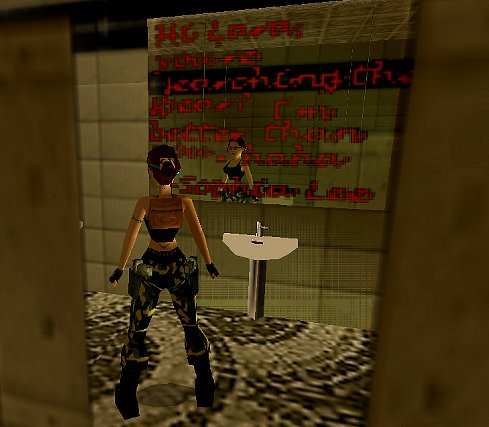Im nächsten Raum gehst du nach rechts, wo dich zwei Wachen erwarten. Hier siehst du mit dem Fernglas (Handlungstaste drücken) einige Laserfallen. Du kannst sie auch durch eine Fackel sichtbar machen, und kriechst hindurch, wenn sie gerade oben sind. Beim Schießstand wirfst du die Münze in den Getränke-Automaten ein, worauf sich Lara eine dringend nötige Erfrischung gönnt, und sammelst den Schlüssel, Chloroform und die Notiz ein. Auf der Notiz stehen einige Hinweise, die du aber bereits als erledigt betrachten kannst. Jetzt geht es wieder zurück zu den WCs, wo du mit dem Schlüssel die Waschmaschine öffnest, und ein frisch gewaschenes, aprilfrisches Tuch entnimmst. Achtung: Dazu mußt du nochmal die Handlungstaste drücken! Dann gehst du weiter zurück und nach rechts in den Kontrollraum mit der Wache. Stelle dich hinter ihn, kombiniere das Tuch mit dem Chloroform, und benutze es. Danach kannst du die ID-Karte aufheben. Damit öffnest du in der Nähe die Tür bei dem grünen Warnschild.