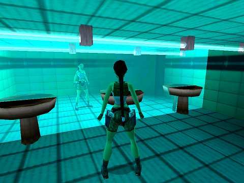 Begib dich wieder zurück zu der Laser-Falle. Du findest einen Schalter, den du drückst, und schnell durch die Tür läufst, da dich das allseits beliebte automatische MG beschießt. Im nächsten Raum gibt es wieder die bekannten leeren Regale (Lara befindet sich in der Ex-DDR), klettere lieber die Leiter hinauf. Im nächsten Gang hangelst du an der Decke weiter, und ziehst dann die Pistolen. Hinter der automatischen Tür drückst du den Schalter, und gehst dann die Treppe hinauf. Nun kletterst du an der Wand hinauf, findest einen Schalter, und schießt auf den Feuerlöscher.