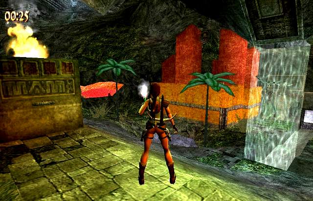 Drachenkopf an. Springe wieder zurück, gehe dort ins Wasser, so daß Lara die