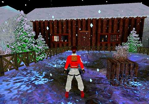 Hierbei handelt es sich um ein "Weihnachts-Level" ohne Gegner. Um das Level spielen zu können, installierst du am besten den Level Manager. Nach rechts in den Gang gehen, die halbe Schneekugel wegziehen und Speed Fuel nehmen. Dann den anderen Gang bis zum Ende gehen und den Schneemann zerschießen und die Brechstange nehmen, diese in der anderen Ecke als Hebel einsetzen und nebenan das Speed Fuel am Schneemobil einsetzen und mit Anlauf und der Spurt-Taste über die Sprungschanze fahren und dann absteigen. An der nächsten Kurve kann man sich auf die Schneemauer hochziehen und den schwer erkennbaren Ice Crystal nehmen. Außerdem kann man zurück zum Levelbeginn und Secret 1 holen. Dann zurück zu der Grube bei der Sprungschanze und hinunter klettern. Den Crystal einsetzen und die Armbrust holen. Wieder hinauf und über die nächste Sprungschanze fahren, absteigen, den Schneemann zerschießen und das Laservisier nehmen. Laser und Armbrust kombinieren und die 2 durchsichtigen Kugeln über dem Eingang der Hütte zerschießen und hinein gehen. Links den Schalter drücken und die Wasserflasche holen. Zurück zur Sprungschanze, hinuntersteigen und die Wasserflasche auffüllen. Dann in der Hütte vor das Kaminfeuer stellen, das Feuer mit der Wasserflasche löschen und den Library Key nehmen und die Tür aufsperren. Drinnen rechts das Regal neben dem Kamin heraus ziehen und Secret 2 nehmen, die Vase zerschießen und Kerze 1 nehmen, dann auf das Regal steigen und die Deckenluke öffnen. Den Kitchen Key holen und den anderen Raum aufsperren. In der Küche den Schalter drücken und in den Keller hinunter gehen und in dem Raum mit den Kisten rechts hinten oben auf den Kisten die Bodenluke in der Ecke öffnen und die Holzfackel holen und oben in der Bibliothek anzünden, dann draußen im zugefrorenen See den Busch in der Mitte anzünden und den Unterwasser-Hebel ziehen. Zurück in den Keller und Kerze 2 nehmen. Die 2 hellen Kisten wegziehen und den Schalter drücken. Aus dem anderen Keller Secret 3 aus der Schachtel holen und den Schalter drücken. Dann oben im Kamin auf den Dachboden klettern. Den Hebel an der Säule drücken, auf den neuen Block steigen und die Kiste wegziehen, dann Kerze 3 nehmen, die Kiste weiter schieben und mit dem Hebel nach unten fahren, dann auf die markierte Bodenplatte schieben und auf den neuen Block steigen. Auf die helle Säule springen und an der Decke zum Silver Star hangeln. Dann an der Decke zu dem Paket = Secret 4 hangeln, und dann zu dem Wandhebel an der Säule. Jetzt durch die Bodenluke ins Bad hinunter und aus dem Wasser Secret 5 holen, dann den Schalter drücken, hinaus und den nächsten Schalter drücken und im Schlafzimmer den Star einsetzen. Hineinkriechen und draußen in der Ecke zu Kerze 4 kriechen. Zurück in die Hütte und die 4 Kerzen auf den Adventskranz stellen, dann bei der Sprungschanze von dem Schneemann Santas Star holen. Wieder zurück in die Hütte, im Schlafzimmer hinaus kriechen, und den Star bei dem Weihnachtsmann einsetzen...