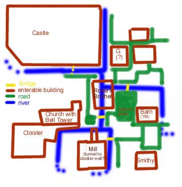 Karte von Dayport, Barn (TM) = Levelbeginn Gehe hinaus, ziehe dich auf das Brett hoch und öffne die Tür, gehe hinaus und springe nach links hinauf auf die Mauer, lasse dich hinunter und zerschieße die Kiste bei den zwei Galgenmännern. Nimm die Holzfackel, gehe über die Brücke und zünde sie bei dem Schild Rosies an. Lasse die Fackel dann liegen, und merke dir, an welcher Stelle. Springe in den Bach und tauche unter Rosies Haus. Gehe in der Öffnung an Land, öffne links die Tür und auch die nächste Tür, gehe weiter, die Treppe hinauf und hole rechts aus einem Zimmer Left Gauntlet. Zerschieße hier das Gitter am Fenster, öffne das Fenster und ziehe dich wieder hinauf in das Zimmer. Begib dich dann durch ein Fenster auf der anderen Seite wieder hinaus und gehe am Galgenplatz rechts in Richtung der Brücke, vor dieser Brücke gehst du links weiter, und springst auf den Holzsteg am Wasser. Gehe zum Wasserrad weiter und springe von der Mauer aus nach rechts zu dem roten Dach, halte dich fest, hangle nach rechts, ziehe dich hoch und springe mit Rolle auf den Balkon ab, hier liegt eine Überraschung. Springe in den sicheren Teil des Bachs und gehe an Land, dann links über die Brücke und in den Gang zur Mühle = Mill auf der Karte Die Mühle Öffne die Tür mit dem Hebel. Drinnen steigst du links die Leiter hinunter und springst kurz vor dem Ende ab. Hier kannst du den Sack, der am Boden liegt, wegziehen. Jetzt schiebst du die dunkle Kiste auf die andere Seite. Hier mußt du noch den Sack wegziehen und die Kiste dorthin schieben, wo der sack war. Lasse dich dann hinunter, ziehe den Sack weg, schiebe die Kiste hinein und ziehe am Seil. Dann schiebst du oben die Kiste auf die neue Plattform > das Rad bleibt stehen. Lasse dich hinunter, und direkt da, wo sich der Stein gedreht hat, kannst du ein paar Bodenluken öffnen. Gehe dort hinunter, tauche in den Gang, lasse dich von der Strömung mitnehmen und tauche bis zum Ende, wo du an der Stange hochspringst und hinauf kletterst. Im Kloster In einer Ecke sind zwei Eingänge, gehe zuerst links in die Kirche. Springe hinten am Seil hoch, festhalten, und schwinge nach links in den Kriechgang. Lasse dich auf der anderen Seite hinunter und springe auf die schräge Holzplatte an der anderen Wand. Dann geht es links weiter hinauf und mit Anlauf auf die Plattform in der Ecke. Springe zum Brett bei dem Seil, ziehe dich darauf hoch und springe schnell rückwärts auf das Brett ab. Springe hinüber und ziehe am Seil. Dann springst du zurück auf die Plattform, dann an das Seil, rutschst etwas hinunter und springst rückwärts auf die Plattform ab. Lasse dich weiter hinunter und nimm Bronze Bell Tounge. Jetzt begibst du dich wieder zurück in die Kirche, hinaus, und gleich links in den Eingang mit dem Vorhang. Öffne am Ende mit dem Hebel die Tür und springe gleich rechts über den Bach, gehe auf der Mauer am Bach weiter und krieche unter dem Dach hindurch, um Wertsachen zu holen. Die Kanone Kehre zurück zum Galgenplatz, nimm deine brennende Holzfackel vom Beginn und gehe über die Brücke weiter, dann rechts, bis du eine Kanone am Boden liegend findest, die du anzündest. Gehe hinein, die Treppe hinauf, und öffne links von der Treppe das Fenster. Dann gehst du weiter zu dem Platz, wo das Seil herunter hängt. Springe von der Kiste (rechts) schießend ab, um das Gitter im Fenster unter dem Seil zu zerschießen. Nun mußt du wieder zurück in das letzte Haus. Das linke Fenster ist schon offen, öffne jetzt das andere Fenster, gehe wieder zurück zu diesem Fenster und springe hinüber in das andere Haus. Öffne die Deckenluke und ziehe dich hoch. Zerschieße das Gitter am Fenster und springe nach rechts auf das Dach, hangle nach links weiter, bis du über der Kiste bist, ziehe dich hoch und springe mit Rolle an das Seil ab. Schwinge mit gedrückter Handlungstaste in die Öffnung. Knie dich links hin und nimm den Letter unter dem Tisch, öffne dort das Fenster und ziehe im nächsten Raum rechts die Kiste weg, um Mould with Key Shape zu nehmen. Gehe zurück in den anderen Raum und ziehe links den Hebel = Secret 7. Springe hinunter ins Wasser, tauche weiter, und gehe an Land. Hier mußt du die Kisten verschieben, bis du eine große Wasserflasche findest und das Seil ziehen kannst. Tauche wieder zurück, steige die Leiter hinauf und begib dich wieder hinaus ins Freie. Gehe zurück zum Galgenbaum und nimm deine brennende Holzfackel, oder zünde eine neue an. Gehe hinunter zu dem Haus mit dem Schild: J. Fax Smithy Zerschieße rechts das Geländer, ziehe den Sack weg, nimm den Not very well hidden Key, sperre die Tür auf und nimm drinnen rechts das Brecheisen. Dann setzt du im Wasser den Mould with Key Shape ein und steigst die Leiter hinauf in den ersten Stock. Zerschieße die Kiste, nimm die Armbrust und setze den Bronze Bell Tounge in die Öffnung ein. Gehe wieder hinunter, hole deine Holzfackel und zünde damit den Holzhaufen in der Kiste an. Betätige mit dem Brecheisen den Hebel und nimm Bronze Key (Castle) aus dem Wasser. Gehe hinaus und weiter zu dem Wassergraben an der Burg = Castle auf der Karte. Zerschieße das Seil, das die Zugbrücke hält, sperre auf und gehe hinein... savegame.0 Dayport Sunset Castle Gehe nach rechts in den Gang, zerschieße die Kiste, nimm eine Holzfackel und zünde sie dort an. Gehe in den anderen Gang, ziehe den Hebel und steige die Leiter hinauf. Links kannst du die Deckenluke öffnen. Den Hebel rechts noch nicht ziehen, sondern zuerst dort das Fenster aufmachen, dann wieder hinauf steigen und jetzt den Hebel rechts ziehen. Nun weiter hinauf, drehe das Rad sechsmal, springe rückwärts hinunter, laufe durch das Fenster und spurte durch die Tür. Klettere rechts im Gang hinauf, gehe durch die automatische Tür und durch die nächste Tür, die du mit dem Hebel öffnest. Rutsche hinunter in den Keller und gehe geradeaus weiter zu dem Geist. Setze rechts das Brecheisen als Hebel ein und gehe durch den Sarg weiter in den näch