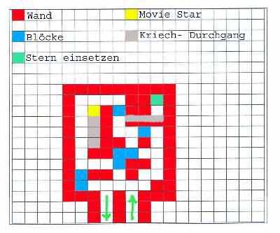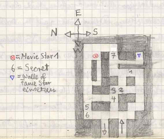 1. Block 1 zweimal hinein schieben 2. Block 2 einmal heraus ziehen (von Osten = E her) 3. Block 3 zweimal heraus ziehen (von S her) 4. Block 4 einmal hinein schieben >>> Movie Star 1 holen 5. Block 5 viermal heraus ziehen und durch den Gang zurück kriechen 6. Block 6 einmal heraus ziehen >>> Secret 1 holen 7. Block 7 zweimal hinein schieben >>> Walk of Fame einsetzen >>> nun ist der Ausgang offen... Hier ist ein Bild, das von Thunder angefertigt wurde:
