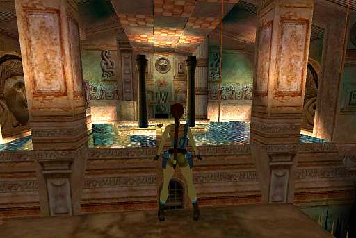 Um das Level spielen zu können, installierst du am besten den Level Manager. Es gibt unten eine dunkelbraune Stelle. An die Kante hängen, loslassen und rückwärts auf diese Stelle springen, dann die Treppe hinunter gehen und links an der Wand zu Secret 1 = Granatwerfer hinauf klettern. Dann unten am Wasser den Hebel ziehen und wieder zurück und durch das Tor gehen. Man darf die markierten Bodenplatten nicht betreten! Darüber springen, dann hinunter rutschen und den Kugeln ausweichen. Ins Wasser tauchen und weiter, bis man wieder an Land gehen kann. Das Skelett beseitigen und den Granatwerfer nehmen. Die Säule auf die Bodenplatte schieben und nebenan auf die Plattform hochziehen. Dann an der Decke weiter hangeln und zu dem Eingang springen. An der Stange hochklettern und den Hathor Effigy nehmen. Nun zurück tauchen. Es gibt ein Luftloch, dort Pause machen, dann weiter tauchen, bis Lara an Land gehen kann. Weiter, die Vase zerschießen und die Shotgun nehmen. Weiter und aus dem Wasser das Laservisier nehmen. Dann den Ornate Handle nehmen, die Leiter hinauf steigen und vor die Statue stellen. Dort weiter gehen und ins Wasser hinab lassen. Weiter tauchen und an Land gehen und den Revolver holen. Dort in den Eingang springen und den Schalter drücken. Zurück und hinunter zur nächsten Öffnung tauchen. Dort das Laservisier nehmen und hinüber zur Stange springen und hinauf klettern. Dann weiter gehen und mit Revolver plus Laser die Vase auf der Säule abschießen. Jetzt vom Block aus auf die Säule springen. An der Decke weiter hangeln und zur Kletterwand, dann zur Öffnung klettern, hineinziehen, und schnell wieder zurück und zur Seite hangeln. Dort hinauf klettern, und weiter bis zur Stange. Oben angekommen weiter gehen und die Schrägen hinunter rutschen. Dann zu der Vogel-Statue gehen. Dort weiter zum großen Schalter. Dann an den Seilen zum Hebel schwingen. Über die gläserne Brücke gehen. Im nächsten Raum liegt der Granatwerfer. Links in die Öffnung in der Wand ziehen und hinauf klettern. Die Säule auf die markierte Bodenplatte schieben und auf den neuen Block steigen. An der Decke zu der Öffnung hangeln und hineinziehen und hoch klettern. Draußen an der Säule hinauf klettern und auf die durchsichtige Plattform abspringen. Drüben den Hathor mit dem Handle kombinieren und einsetzen. Nun wieder hinunter und in den nächsten Raum gehen. Auf die markierten Bodenplatten stellen, so daß man die Säule auf die Platte schieben kann, und danach die Leiter hinauf steigen...