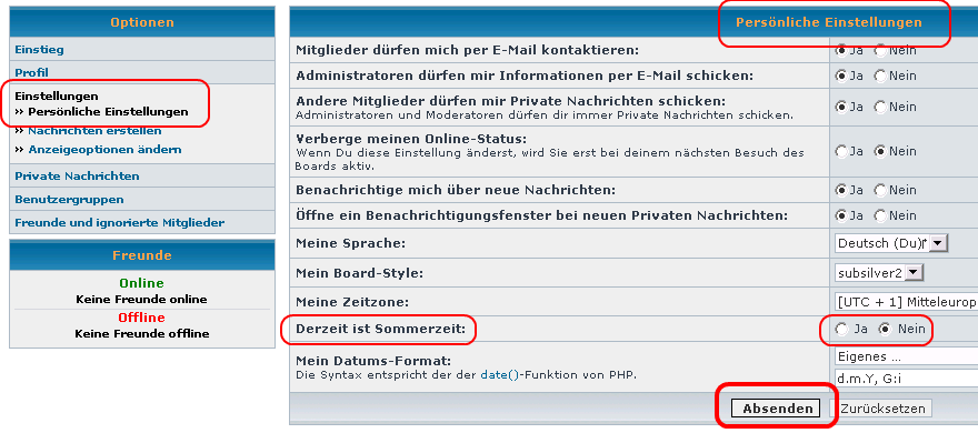 Ihr müßt jetzt rechts oben in eurem persönlichen Bereich > Einstellungen > Persönliche Einstellungen die Sommerzeit abschalten:
