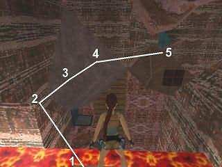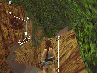 Laufe zur Hand der Statue und häng dich an die Kante der hellblauen Plattform. Dann lässt du dich runter fallen um unten sicher im Wasser zu landen. Klettere hinaus und begib dich zu den dunklen Säulen/Schrägen. Eine ist bekletterbar, also kletterst du hinauf, zweimal um die Ecke und per Rückwärtssalto auf das "Dach". Von hier mit einem langen Sprung auf die transparente Raute und von dort zum Kriechspalt. Krieche hinein und folge dem Gang in den nächsten Raum. Hier springst du an die Kante der bunten Schräge auf der linken Seite, ziehst dich hoch und per Rückwärtssalto landest du auf einer weiteren Schräge. In der Luft musst du so lenken, dass du vorwärts abspringen und in der Luft nach rechts lenken kannst. Dann musst du dich beim runterrutschen an der Kante der hellen Schräge festhalten (3). Hangele einmal rechts um die Ecke und dann soweit seitlich wie möglich. Zieh dich erneut hoch und führe einen Rückwärtssalto mit Drehung aus und lenke dabei leicht nach links. Halte dabei immer die Sprungtaste gedrückt, damit du direkt von der nächsten Schräge (5) abspringen kannst. Leider springt Lara dort durch die links Drehung gezwungener Maßen rückwärts ab, also musst du schnell eine Drehung machen. So landest du vorwärts auf der letzten hellen Schräge (6) und du kannst mit rechtsdrall auf die Säule (7) springen.