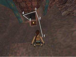 Beim einfachen Weg musst du dich in der Nähe der Säulen rückwärts in das Loch fallen lassen und in der Luft die Handlungstaste drücken, damit Lara etwas nach vorne fällt. So landest du auf einer Schräge von der aus du nach vorne abspringt um rechts auf einer dreieckigen Fläche zu landen. Aus dem Stand springst du über die Schräge, um auf der anderen Seite abzurutschen und vorwärts mit Rechtsdrehung abzuspringen. Du landet in der Ecke und kannst von dort mit Anlauf zum nächsten Vorsprung springen. Jetzt rutschst du die Schräge die zur Mitte geneigt ist hinab und springst zur Säule in der Mitte. Von hier mit Anlauf zum Kriechspalt, reinklettern und im nächsten Raum die Fackeln mitnehmen.