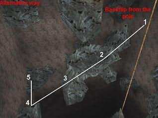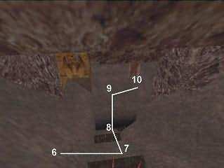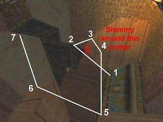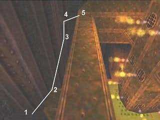 Mit Anlauf springst du auf die Schräge, von der du direkt wieder vorspringst. Lenke in der Luft nach rechts damit du soweit wie möglich links landest, weil du beim hinabrutschen automatisch auf die rechte Schräge (4) wechseln musst. Hast du das geschafft direkt abspringen und mit einem Bogensprung nach links in die Nische (5). Von hier hochspringen und an der Kante festhalten. Hochziehen und von der Schräge rückwärts abspringen und auf einer dreieckigen Fläche landen. Jetzt gemütlich hochziehen und du bist endlich oben (8).