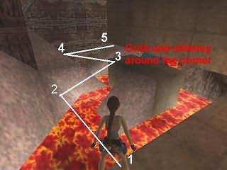 Nachdem du den Schalter umgelegt hast erscheint eine kurze Sequenz, die dir zeigt welche Türe sich geöffnet hat. Jetzt musst du aus dem Stand hinunter in den Lavaraum springen und versuchen auf der Schräge (2) zu landen. Von dieser rutschst du auf die nächste Schräge (3) und springst so lange vorwärts weiter, bis du die Kante bei der geöffneten Türe (7) greifen kannst. Zieh dich hoch und per Rückwärtssalto mit Drehung in der Luft kannst du dich an der Leiter (8) festhalten. Klettere hinauf und arbeite dich über die Schräge an die nächste Leiter vor (9). Jetzt kletterst du so weit wie möglich nach rechts, springst rückwärts auf die Schräge und direkt wieder vorwärts, wobei du nach rechts lenken und die Handlungstaste drücken musst, um letztlich sicher auf dem Block (11) zu landen.