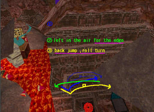 An dieser Stelle einmal tief durchatmen, denn das war noch der einfache Teil. Laufe an der Hammerfalle vorbei und sieh dir den nächsten Abschnitt an. Es folgt nämlich der (meiner Meinung nach) schwerste Sprung des Levels. Mit Anlauf springst du auf die Schräge zu deiner Linken, an deren Ende weiter vorwärts und dann zwischen den Schrägen hin und her (blaue Pfeile). Dabei drehst du dich einmal in der Luft. Sobald du rückwärts auf die zweite Schräge gesprungen bist, versuchst du beim Vorwärtssprung nach links zu lenken, um die Kante der Schräge zu erreichen (grüner Pfeil). Dann lässt du dich bis zum Ende der Schräge rückwärts runterrutschen, springst ab und drehst dich in der Luft. Im Flug hältst du die ganze Zeit die Vorwärtstaste gedrückt, damit Lara auf die flache Bodenplatte läuft. (gelber Pfeil)