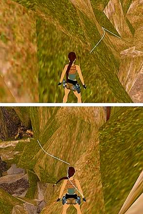 Beschreibung Secret 1: In der Nähe des Sees kannst du einen hohen spitzen Berg erkennen. Gegenüber davon befindet sich eine dunkelgrüne Textur, welche eine durchsichtige Wand kennzeichnet. Du kannst also einfach hindurch springen. Drinnen findest du ein kleines Medipack (Secret 1). Jetzt schaust du dir die Wand auf der anderen Seite der Schlucht mal genau an. Dort befindet sich ein kaum sichtbarer Hangelspalt. An einer Stelle bildet dieser ein kleines "V", dort kannst du hinspringen und dich festhalten. Hangele dich den ganzen Weg entlang und zieh dich am Ende hoch. Dreh dich um und springe mit Anlauf zur Schlucht und halte dich an der Decke fest. Jetzt hangelst du so weit wie möglich und dann nach links an die Wand. Lass dich fallen und klettere nach unten. Da findest du im Gang noch mal Uzi Munition. Anschließend kletterst du die andere Wand nach oben, durch das Loch in der Decke, ziehst dich am Ende in den Kriechspalt und kriechst nach draußen. Von hier oben springst du nach unten ins Wasser.