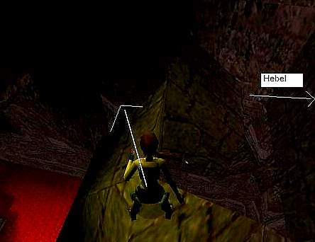 Du kommst wieder in den Lavaraum, aber hoch oben. Begib dich ganz nach links und per Seitwärtssalto, Rückwärtssalto und Vorwärtssprung gelangst du eine Ebene höher. Hier findest du Wandschalter #4, welcher im Käfigraum einen neuen Gang freilegt. Häng dich hinter dem Schalter an die Kante und lass dich nach unten und nimm das kleine Medipack. Jetzt springst du über die beiden dreieckigen Plattformen wieder nach oben. Wenn du auf der zweiten stehst musst du nach Norden zur Wand schauen. Etwas tiefer kannst du die Ecke eines Vorsprunges erkennen. Mit einem Standsprung solltest du dorthin kommen und Wandschalter #5 betätigen können. (MBashi05)
