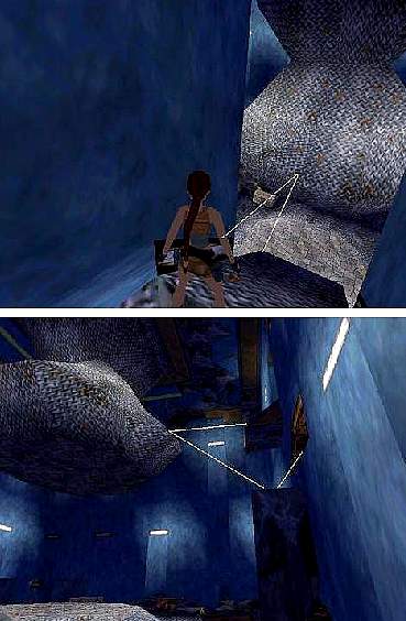 Im Wasser gibt es eine Öffnung durch die du weiter nach unten tauchen kannst. Leider hindert dich eine Strömung daran, aber dadurch wurde draußen das große Tor geöffnet. Also begibst du dich als nächstes dorthin, tötest die Ninjas, nimmst die Uzi Munition an dich und betätigst den Hebel in der Ecke. Dieser öffnet das Gitter wo du erneut von mehreren Ninjas angegriffen wirst. Hinten im Raum sind zwei weiße Schrägen. Mit Anlauf springst du darüber an die Wand und hältst dich fest. Klettere nach oben und per Rückwärtssalto kommst du wieder nach draußen. Im Westen findest du Uzi Munition auf einem Block. Von hier musst du im Bogen anlaufen und nach Süden auf eine dreieckige Fläche springen. Ein weiterer Ninja wird dich attackieren, also entledige dich diesem.