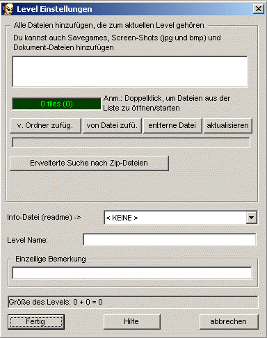 3. Klicke auf "v. Ordner zufüg." (von Ordner hinzufügen) oder auf "von Datei zufü." und suche die gewünschte Zip-Datei, dann mußt du nur noch den gewünschten Level-Namen eingeben, und kannst auch noch eine beliebige Bemerkung hinzufügen, und auf "Fertig" klicken, den Rest macht der Level Manager, und wenn er fertig ist, klickst du auf "Spiel". Das war's, viel Spaß mit deinem neuen Spiel...