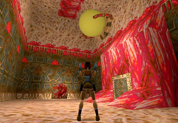 Erfolg: "QTN" = Stelle dich auf die Throne aller drei Herrscher. Also es gibt da drei verschiebbare Blöcke bzw. Quader, die mit Q, T und N beschriftet sind, und aussehen wie ein großer Stuhl bzw. Thron. Da muß man einfach auf alle draufspringen oder klettern. Schiebe den Quader im N-Tor zwei mal nach hinten und gehe hinter das T-Tor. Betätige dort den rechten Schalter, springe sofort zurück und lasse dich in die so geöffnete Grube hinab (von der Kante direkt an der Wand, um den Sturz zu mildern). Hier findest du eine Lava-Grube. Springe von der Kante vor und gleich wieder zurück, um die Kugel darin zu versenken. Nun ist der Weg frei zu einem Schalter (links), den du betätigst und im weiteren Verlauf hinter dem dritten Tor landest. Von dort geht es wieder hinter das T-Tor, wo jetzt die Tür offen ist. Sie führt in einen Raum mit drei widerlichen Kugeln. Nähere dich kampfbereit der großen (hinten), deren Inhalt du mit seitlich springen und schießen beseitigst, sammle dann die Munition links und rechts vom Eingang. Gegenüber wartet ein Schalter, der nicht nur die Tür in der Mitte öffnet, sondern auch noch die beiden anderen Kugeln in Alarmbereitschaft versetzt, die sich aber überlisten lassen: gehe vom Schalter (nachdem du ihn betätigt hast) seitlich an der Wand entlang bis zu der Stelle der großen Kugel und laufe von dort durch die Tür in der Mitte (Kristall 7 von 7). SG6 Laras Doppelgängerin Du rutschst eine Schräge hinunter (von hier bis zum nächsten Raum kann [in der originalen Version] das Spiel nicht korrekt gespeichert werden. Sollte auf Grund dessen die zweite Lara plötzlich wie angewurzelt stehen bleiben (oder verschwinden), kannst du sie mit einem Sprung auf die Eingangsrampe wieder aktivieren, oder du mußt einen Spielstand von vorher laden.). Bleibe dort stehen und bekämpfe zwei Untiere, oder laufe schnell hinter dem Pfeiler nach rechts, um auf den Block zu klettern. Gehe dann weiter und du siehst ein seltsames Wesen, auf das Lara sofort zielt, du aber vorsichtshalber nicht schießt. Du wirst bald erkennen, daß dieses Wesen dir alle Bewegungen nachahmt. Es scheint eine Art dämonisches Spiegelbild ("Doppelgänger") von Lara zu sein (für Mathematiker: es handelt sich um Punktsymmetrie mit Zentrum in der Mitte des Raumes). Damit ist auch klar, daß du dich selbst erschießen würdest. Wie aber loswerden? Erkunde den Raum: über die Schräge und die schwarze Säule rechts vom Eingang kannst du mit Anlauf und dem richtigen Winkel auf eine Ebene mit Schalter springen. Dieser öffnet für kurze Zeit die Falltür daneben mit Lava darunter. Präge dir den genauen Ort der Falltür ein. Nach weiterer Erkundung findest du dieselbe Konstruktion auf der anderen Seite, allerdings ohne Schalter und Falltür. Jetzt zündet der Funke: wie wäre es, wenn du die Falltür öffnest und dich auf der anderen Seite ohne Falltür auf die entsprechende Stelle stellst? Lara 2 würde dir alles nachahmen und in der Lava verschwinden. Gesagt, getan: Betätige den Schalter, mache eine Rückwärtsrolle (Ende drücken) und laufe geradeaus zu der kleineren, braunen Säule auf der anderen Seite, an der du dich hochziehst und ohne Anlauf zu der höheren springst. Von dort geht es mit Anlauf auf die Ebene und dann auf die Stelle der Falltür. Siehe da, die böse Lara verschwindet nach unten, es lebe Lara, die einfach zu clever ist. Erfolg: "Mach's wie der Prinz" = Lass dich nicht von deinem Doppelgänger verletzen. Dürfte klar sein... Oder auch nicht! Also wenn du in der Halle bist, kommt die doppelte Lara, und wenn du auf sie schießt, schießt die zurück, und dann war's das mit dem Erfolg. Und da sind auch noch zwei Monster in der Halle, also das wird schwierig. Aber die doppelte Lara kommt erst, wenn du die Halle betrittst, also wenn du noch auf dem Feld bei der Schräge vom Eingang bist, mußt du von dort aus die zwei Monster beseitigen, die andere Lara ist dann noch nicht da, verstehste? Der Ausgang des Raumes liegt auf der Ebene der Falltür. Im folgenden Gang SG7 findest du eine Schachtel Patronen. Kurz bevor du die zweite Schachtel erreichst, erscheint ein schlimmes Monster: laufe schießend genügend weit rückwärts und springe dann immer von links nach rechts. Wenn ausreichend Platz vorhanden ist, bewährt sich diese Taktik übrigens bei fast allen Kämpfen. Nach der zweiten Schachtel wartet links (oder rechts, vorher gucken!) noch ein Fabeltier (z.B. schießend vor/zurückspringen). Schließlich stehst du vor einem Lava-See, wo du zuerst links die Uzi-Magazine holst. Gehe danach rechts herum zu dem Schalter. Von nun an ist fehlerfreies Spitzentempo gefragt: öffne mit ihm für kurze Zeit die Ausgangstür, mache eine Rückwärtsrolle und laufe zu dem Schalter auf der gegenüberliegenden Seite, um für noch kürzere Zeit die Brücke dorthin zu aktivieren, über die du hoffentlich beim ersten Versuch den letzten Raum des Levels betrittst. SG8 Am Eingang liegt Munition. Erfolg: "Geheimtür" = Es ist nicht der richtige Zeitpunkt, um hier zu sein. Hier ist eine Tür für dich. Auf der großen Plattform des Kampfes im nächsten Level ist an der rechten Wand eine Geheimtür, springe auf diese Plattform, und gehe nach rechts... Erfolg: "Shelleys Zugabe" = Lass Lara bei einem Sturz zweimal schreien. Nicht auf diese große Plattform springen, sondern dort einfach hinunter in die Lava... Du erblickst eine rotierende Maschine, in deren Mitte der Scion schwebt, den du natürlich zurück haben willst. Nähere dich über die kleine seitliche Rampe und greife zu (Handlungstaste). Zum Abschluß des Levels erscheint Natla...