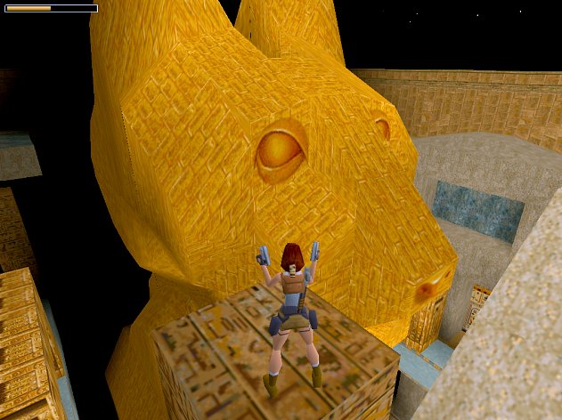 In dem Raum dahinter läßt du dich auf den Block herab und dann auf den Steg. Springe über die Dornen zu den beiden Nischen mit den Wertsachen und dann von dem Steg in der Mitte aus mit Anlauf auf die Spitze der kleinen Schräge. Dahinter drückst du den Hebel und kletterst wieder hinauf in die Kammer, wo jetzt die Tür geöffnet ist. Dort stehst du vor einem Wasserloch. Tauche zuerst gerade hinunter und nach links in eine Kammer, wo am Grund Munition liegt (nehmen), dann geht es schnell wieder zurück und an Land. Normalerweise müßte dir ein Krokodil gefolgt sein, daß du jetzt erlegen kannst. Wenn nicht, mußt du es ein paar mal anlocken und beseitigen, sonst hast du bei dem folgenden Tauchgang wenig Überlebenschancen. Jetzt tauchst du in die Öffnung, die unter dem Eingang zu dieser Kammer liegt, und folgst dem Weg im Uhrzeigersinn, bis du weitere Munition findest. Kehre kurz zurück zum Beginn, um Luft zu holen, und tauche wieder zu der Stelle, wo gerade die Munition lag. Dann geht es weiter, bis du an der linken Wand einen schwer erkennbaren Hebel findest und drückst. Danach tauchst du wieder zurück zum Beginn. In der Kammer ist jetzt der Ausgang geöffnet. Im nächsten Raum mußt du dich auf die beiden Bodenplatten mit dem Gesicht stellen, um den Ausgang zu öffnen, aber Achtung, dahinter lauern zwei Mumien. Trick: schnell wieder in den vorherigen Raum laufen und auf eine seitliche Mauer klettern. In dem neuen Raum drückst du beide Hebel und gehst zu der Öffnung, wo die Kugel stand. Hier wartet ein Krokodil auf dich. Laufe/springe in die Öffnung mit dem Medipack, beseitige es und nimm die restlichen Wertsachen. Erfolg: Nicht der erste Räuber hier = Starre 5 Sekunden lang Laras uraltes Abbild an der Wand an. Das gibt es anscheinend an mehreren Orten, es ist ein hellbraunes Bild von Lara an der Wand. Hier ist ein Beispiel: unten sind die "laufenden Katzen" zu sehen, und oben in der Nische sieht man die Füße von diesem Lara-Bild. Der Erfolg ist in meinem entsprechenden Video zu sehen. Klicken zum vergrößern! Dort kletterst du hinauf und läßt dich am Ende in das große Becken fallen. Gehe an Land und ganz oben in der Ecke links vom Gitter in die neue Halle, wo du zunächst die Munition (bzw. Uzi) auf dem Block nimmst. Halle mit 8 Mumien Klar, daß die Mumien der Reihe nach erwachen, wenn du die Wertsachen nimmst. Laufe also zuerst hinunter und steige unten gleich links die Blöcke hinauf, um die erste zu beseitigen. Dann holst du dort das Medipack in der Ecke und springst schnell wieder auf den vorherigen Block, um die nächsten beiden zu begrüßen. Wenn du zu der Munition in der anderen Ecke gehst, kommt die vierte Mumie, und wenn du sie nimmst die fünfte. Du kannst beide von oben hinter dem Sandhügel aus auf der Stelle springend erlegen. Gehe nun von hinten her zum Hebel und drücke ihn, um die sechste Mumie zu erwecken und dann noch einmal von vorne her zum Hebel für die siebte Mumie. Jetzt kannst du oben die Wertsachen sammeln (viermal Munition und ein Medipack) und die Halle durch die neue Tür verlassen. Halle mit goldener Treppe Aber Achtung, wenn du in der nächsten Halle die große Treppe hinauf gehst, folgt dir die letzte Mumie (schwere Waffen, oder oben an die Kante hängen bzw. gleich auf den Block laufen). Dann „läufst“ du am oberen Ende der Treppe auf den Block in der rechten Ecke hinunter und läßt dich noch einen Block tiefer. Springe auf den „Steg“ auf der anderen Seite und dort nach links auf den nächsten (zu der Munition kommen wir später). Von hier läßt du dich auf den Boden herab, also nicht zu den Dornen. So erreichst du einen Raum mit Geheimnis 3 (Muni/Medi). Dort führt die Rampe wieder nach oben, aber dir begegnen zwei Kugeln. Der einen entkommst du durch die erste Öffnung links und der anderen durch die nächste Öffnung auf der linken Seite. Erfolg: "Und Action!"