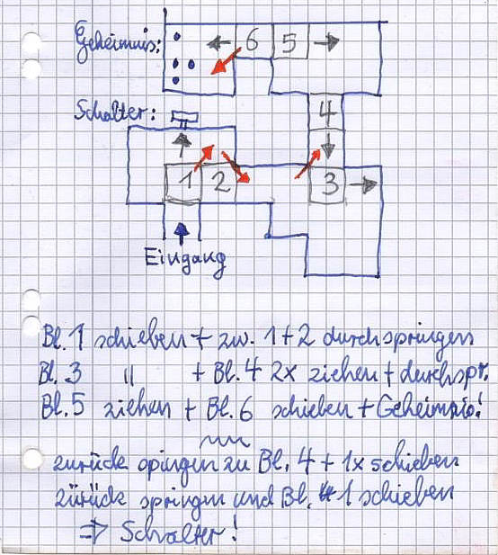 Erfolg: "Katzen-Kodex" = Finde alle Geheimnisse in Ägypten. Wenn du Geheimnis 4 hast. Erfolg: "Sokoban" = Sammle alle geheimen Gegenstände und verlasse den Raum, indem du die Blöcke höchstens 24-mal bewegst. Das müßte hier sein: Du mußt nun ein lustiges Rätsel lösen, um zu Geheimnis 4 zu gelangen (was du notfalls auch lassen kannst) und dabei einige Blöcke verschieben, wobei es praktisch nur eine Möglichkeit gibt. Am besten fertigst du dir eine Skizze an, um dich nicht total zu verirren. Leider ist der Kompaß dabei nur eine Hilfe für Leute, die sich damit auskennen, da er wie jeder echte Kompaß eingenordet werden muß. Außerdem ist zwischen der Blickrichtung der Kamera und Lara zu unterscheiden (Lara schaut auf den Kompaß!). Bei Norden und Süden stimmt’s, die rote Nadel zeigt auf den entsprechenden Buchstaben, wenn Lara in diese Richtung schaut, aber bei Osten und Westen ist es vertauscht, d.h. die weiße Spitze zeigt auf den richtigen Buchstaben. Ich versuche, es ohne Kompaß zu beschreiben. Tip: die beweglichen Blöcke unterscheiden sich von den Wänden nur dadurch, daß sie unten einen kleinen, runden Griff haben. Außerdem ist es hilfreich, wenn man sie auf der Skizze nummeriert (es sind sechs Stück). Die folgende Anleitung (1 bis 10) ist die originale Anleitung von damals: