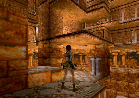 Hier kommst du zu einer Schräge und zu einem äußerst schwierigen Sprung, also vorher speichern! Rutsche hinab und springe kurz vor dem Ende der Rampe hoch (nicht vor!), so daß Lara auf der kurzen Rampe darunter landet. Hier springst du schnell mit Griff nach vorn und ziehst dich in die Öffnung zu Geheimnis 2 (Medipack und Munition*). Trick: man kann auch rückwärts die lange Rampe hinunter rutschen, dann kurz vor dem Ende festhalten drücken, so daß sich Lara an der Kante festhält, dann loslassen, so daß sie auf die nächste Rampe fällt, und dort am Ende rückwärts abspringen, so daß sie in dem Eingang landet. Gehe wieder zurück zum Wasser und erlege das Krokodil. Falls es wegschwimmt, mußt du weitergehen zu dem anderen Wasserbecken und ihm von dort aus den Rest geben. Drücke aber noch nicht den Hebel! Springe ins Wasser und tauche zu der kleinen Öffnung in der Decke, wo du Geheimnis 3 (Munition*) findest. Dann tauchst du zurück und drückst den Hebel, um das Wasser abzulassen. Jetzt geht es hinab in den Kanal. Interessant ist, daß du nun ein totes, schwebendes Krokodil siehst. Achtung! Dieses Krokodil zählt nicht für den Erfolg Deadline!!! Weil es im Wasser ist, und dann zählt das als Tod durch Ertrinken! Am Beginn des 9. Levels kommt ein Krokodil an Land! Große Halle mit vier wichtigen Nebenräumen bzw. Schlüsseln Hinweis: die 5 Neues Spiel + Kristalle sind alle in dieser großen Halle, einer oben am Eingang, drei im Turm, einer unten am Boden. Kann man ja mit der Kamera sehen. Also du kannst dir die einteilen, wie du willst. Am anderen Ende findest du den Ausgang, der dich zu einer großen Halle mit mehreren Etagen bringt (Kristall 1 von 5). SG2 Es geht nun darum, daß du vier Hebel findest und damit vier Räume öffnest, in denen je ein Schlüssel für den Ausgang wartet. Springe mit Anlauf auf den mittleren Steg und erlege drei Fledermäuse. Lasse dich dort eine Etage tiefer, wo du mit dem Hebel den Thor-Raum öffnest. Springe dann über das kleine, quadratische Loch daneben und wieder zurück, um drei weitere Fledermäuse zu erlegen. Wichtig! Zwei (oder drei) Fledermäuse werden tatsächlich nur so angelockt! Also wenn dir am Schluß zwei Kills fehlen, spring da noch mal drüber! Rechts vom Schalter ist an der Wand ein Vorsprung mit einer grauen Bodenplatte, die für kurze Zeit eine Tür mit Geheimnis 4 öffnet. Springe mit Anlauf rechts neben diese Platte, drehe dich zu ihr und stelle dich mit dem Rücken an die Kante. Deine Gesundheit muß nun mindestens 90% betragen. Speichere ab. Nun springst du vor auf die Platte und sofort zurück zur Kante, an die du dich hängst und herabläßt. Unten springst du einmal zurück und gehst rückwärts, um eine Etage tiefer zu landen. Laufe sofort geradeaus los und ziehe die Waffen, um zwei Fledermäuse zu erlegen. Kurz vor dem Ende des Stegs springst du vor und landest direkt vor der Tür mit Geheimnis 4 (Munition und Medipack). SG3 Zurück in der Halle findest und drückst du am mittleren Pfeiler den Hebel für die Atlas-Tür. Hier siehst du auch schon die Ausgangstür mit den vier Schlössern. Gehe dann die Stufen hinauf und ziehe dich am Ende nach oben. Gehe diesen Steg bis zum Ende. Am nächsten Steg siehst du Munition und eine Fledermaus an der Decke. Springe also mit gezogenen Waffen vor auf den Steg und wieder zurück, um sie zu erlegen. Dann holst du die Munition. Begib dich wieder auf den vorherigen Steg und springe mit Anlauf/Griff auf die Plattform in der Mitte. Hier drückst du den Hebel für die Neptun-Tür. Springe dann in die Ecke mit der (noch geschlossenen) Damokles-Tür, wo du auf dem Vordach darüber ein Medipack findest. Gehe bei der Damokles-Tür die Stufen hinauf, springe mit Griff zur mittleren Plattform über dir und ziehe dich hoch. Rechts hinten springst du mit Anlauf und gezogenen Pistolen auf den Steg an der Wand und erlegst zwei Fledermäuse. Springe dann mit Anlauf wieder zurück zur mittleren Plattform. Gehe geradeaus bis zum Ende, drehe dich nach rechts und springe mit Griff zu dem braunen Block an der Wand. Hier gehst du weiter nach rechts oben und erlegst zwei Fledermäuse. Drehe dich dort nach rechts und springe zur mittleren Plattform. Hier findest du hinter den Stufen den Hebel für die Damokles-Tür (drücken). Links davon holst du mit Anlauf ein Medipack und kehrst zum Schalter zurück. Klettere auf den Block rechts vom Schalter und ziehe dich eine Etage höher. Hier springst du mit Anlauf auf die Stufen, die um die Ecke nach oben führen, und erlegst eine Fledermaus. Gehe die Stufen nach oben bis zum Ende, wo du auf der anderen Seite die Neptun-Tür siehst. Springe dorthin (mit Anlauf). SG4 Neptun-Raum Ja, früher glaubten die Menschen noch an den Gott des Donners und so weiter, diese Idioten (die heute "Querdenker" heißen)! Mittlerweile sind wir schlauer, da glauben wir nur noch an Außerirdische, Feng Shui und die Steuerrückerstattung... Und Elvis lebt, die Amis waren nicht am Mond, und Viren gibt's überhaupt nicht... Hier siehst du ein prächtiges Wasserbecken mit wunderschönen Delphinen als Verzierung, da ja Neptun bekanntlich ein Meeresgott ist. Springe hinein und tauche nach unten. Dort siehst du ein Gitter, vor dem du nach links oben in den Gang tauchst, dort den Hebel ziehst und schnell wieder an die Wasseroberfläche tauchst. Jetzt geht es nochmal hinunter zu dem mittlerweile geöffneten Gitter. Hier holst du den Neptun-Schlüssel und kehrst zurück. Verlasse den Raum und springe zurück zur mittleren Plattform. Erfolg: "Wie Salacia" = schaffe es mit dem letzten Atemzug in Neptuns Raum aus dem Wasser. Der Luftbalken muß leer sein! Atlas-Raum Lasse dich dort zwei Etagen tiefer und gehe in den Atlas-Raum. Es begrüßt dich ein Gorilla, vor dem du schießend zurück läufst, oder du springst schnell auf den Vorsprung am Gitter. Dann gehst du zu dem Gitter in der Ecke, das sich automatisch öffnet. Hole dahinter links unten das Medipack und begib dich wieder in den Gang.
