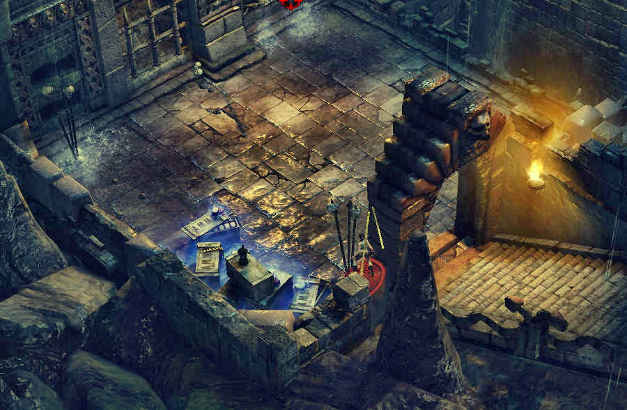 Springe über die Lücke, gehe weiter, und rolle die Kugel hinaus. Dahinter ist der rote Schädel 1/10. Dann rollst du sie vorsichtig an der linken Wand entlang vor dir her, und machst damit alle Pfeilfallen platt. Bonusherausforderung: du mußt dafür alle Pfeilfallen des Levels kaputt machen. Nun kommt ein Skelett, werfe Speere drauf, bis es zerbröselt, dann legst du schnell eine Bombe zu den Resten, und zündest sie, um das Ding endgültig zu beseitigen, sonst kommt es wieder.