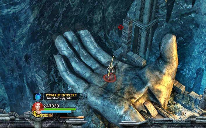 Schließlich springst du über die Lücke, und mußt nun die lange breite Treppe hinauf, die einige Überraschungen in Form von Kugeln und Ameisenbären zu bieten hat. Oben angekommen, gehst du auf die Druckplatte, sprintest mit Rollen hinunter, und springst wieder über die Lücke. Danach gehst du die Treppe wieder hinauf, um auf der großen Hand das Munitions-Upgrade zu holen. 247.000. Jetzt gehst du unten durch das Loch in der Mauer weiter. Hole noch den roten Schädel 10/10 = Artefakt Kriegstrommel, und zerhaue die versteckte Urne 3/3 für ein Munitions-Powerup...