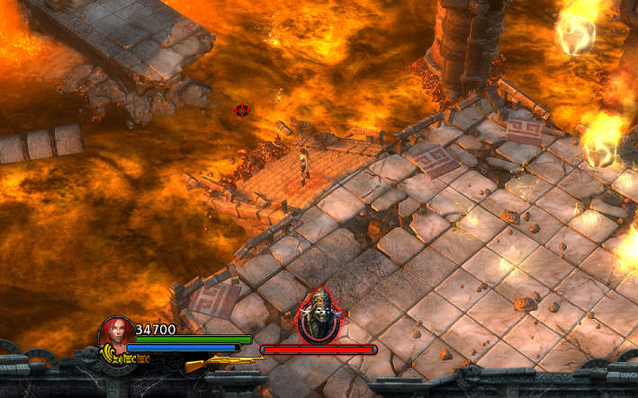Wenn der Obermotz genug hat, das sieht man an seinem Gesundheitsbalken, wie oben auf dem Bild, unten in der Mitte, kommt die große Stachelwalze angerollt, Lege schnell eine Bombe in die Mitte des Feldes, zünde sie, wenn die Walze drüber ist, und laufe oder rolle schnell unter der Walze hindurch zum nächsten KP. Nun springst du weiter hinunter, und nach rechts zum nächsten Kämpfchen. Wenn du hier alles abserviert hast, geht es zum nächsten KP. Nimm dort Muni und Medi auf, und springe hinunter zum letzten Kämpfchen. Hier gibt es auch nicht viel zu sagen. Ballere einfach alles ab, was kommt. Der Obermotz steht meistens auf der Plattform am oberen Bildschirmrand, aber er kommt auch von oben angehüpft. Tip: gehe wann immer möglich auf die Treppe am oberen Bildschirmrand, die hinunter zur Lava führt, wie oben auf dem Bild, dort bist du vor den Niederschlägen sicher! Und rolle ansonsten am Rand der Plattform herum, und schieße ab und zu auf die zwei Kugelwerfer-Elche.