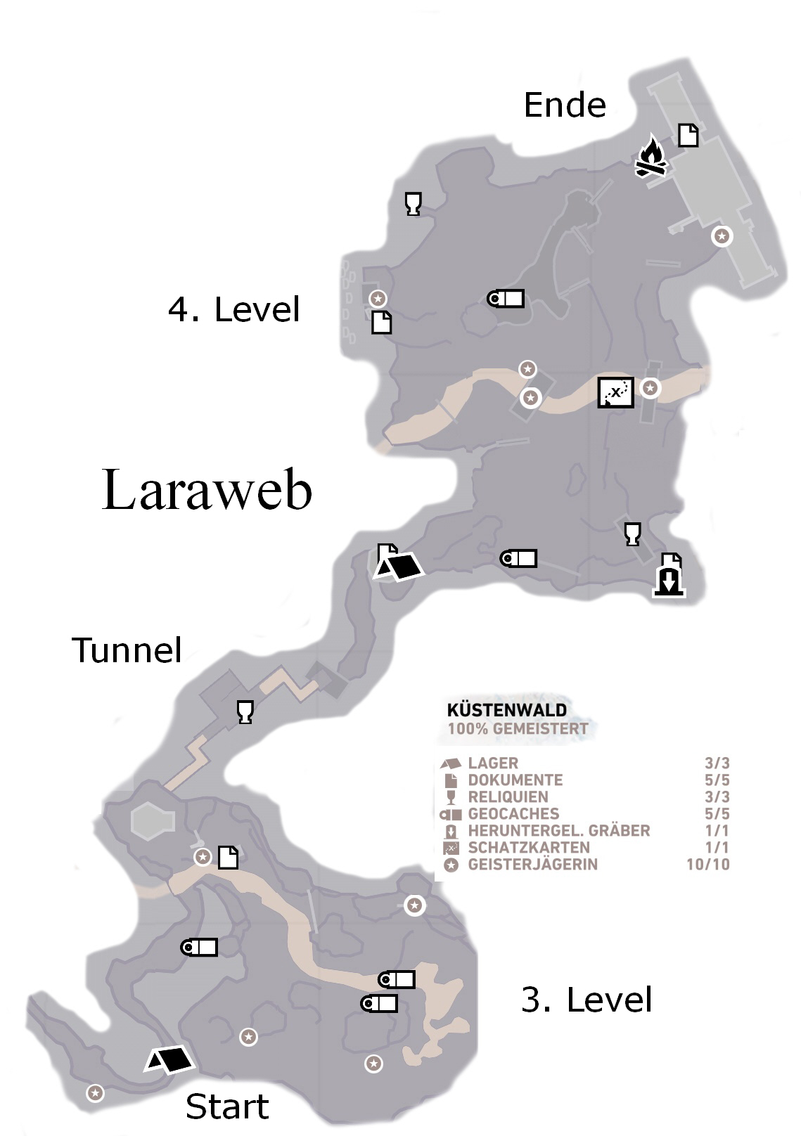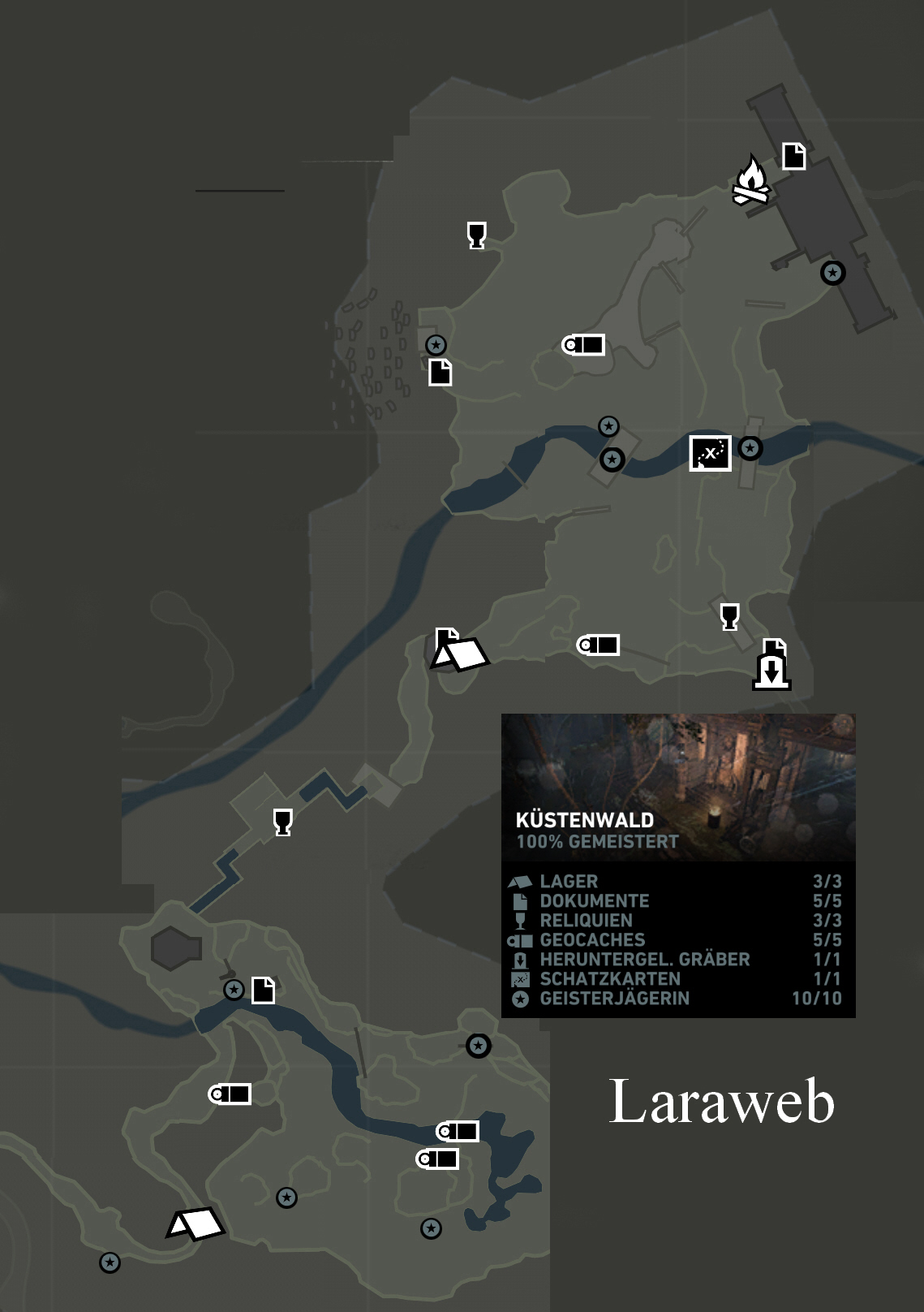 Gehe vom Lager aus nochmal zurück und unter den Felsen hindurch in Richtung Levelbeginn, und dort siehst du links an einem Baum ein Totem (1/10) hängen, das du abschießt, und somit die Herausforderung Geisterjägerin startest. Wie alles andere, das du finden kannst oder sollst, kannst du es mit dem Survival Instinct besser erkennen. Und gehe mit den Pfeilen sparsam um! Dann geht es zurück zu der Mumie, und du siehst an einem Ast Totem 2/10. Dort findest du auch einen gut versteckten umgekippten LKW, aus dem du hinten ein Dokument holst. Gehe nun nach Osten (das ist nach rechts auf der Karte) weiter, bis du unter einem Baum, der quer über zwei Felsen liegt, Totem 3/10 entdeckst. Dort findest du bei dem kleinen Wasserfall unten im Wasser Geocache 1/5. Die sind winzig klein, und man sieht sie praktisch nur mit dem Survival Instinct. Klettere dort auf die Bretterplattform hinauf, um Pfeile und Geocache 2/5 zu holen. Du findest hier gleich in der Nähe Totem 4/10, das von einem Ast hängt. Westlich davon (links auf der Karte) kommst du zu zwei Felsblöcken, an einem hängt Totem 5/10. Gehe nun zurück zur Mumie, und klettere und springe links (Süden - unten auf der Karte) hinauf, bis du Pfeile und Geocache 3/5 findest. Info: Es gibt hier Elche, Zwerghamster und Wellensittiche, die Punkte bringen, und ein paar kleine Sträucher mit braunen Beeren, die du pflücken kannst. Und es gibt auch eine Kiste, die du aber nur mit der Axt öffnen kannst, die du erst im Bunker kriegst. Und lasse dich nicht von der Karte täuschen, dieses Wäldchen ist nicht sehr groß, du kannst hier ruhig alles absuchen. Man kann hier nur eine begrenzte Anzahl von Erfahrungspunkten EP sammeln, wenn die erreicht ist, gibt jedes weitere Tier nur noch einen EP, das wird dir aber dann angezeigt, und sammeln lohnt sich dann nicht mehr wirklich. Wenn deine EP-Anzeige voll ist, erhältst du wie gesagt einen Fähigkeitspunkt FP. Gehe damit zurück ins Lager, und kaufe dir eine Fähigkeit. Dazu mußt du eine Fähigkeit auswählen, und dort siehst du auch, was sie bewirkt, und dann drückst du "Meistern". Ich habe aus der Gruppe "Überleben" die Fähigkeit "Überlebenskunst" genommen, damit kriegt man schneller FP. Gehe dann in den Bunker... Savegame 3 = Das Ende dieses Levels. Lara ist hier zwar am Lagerfeuer, aber es ist alles erledigt, was hier in meiner Lösung steht. Gehe einfach weiter, und durch diese Tür in den Bunker...