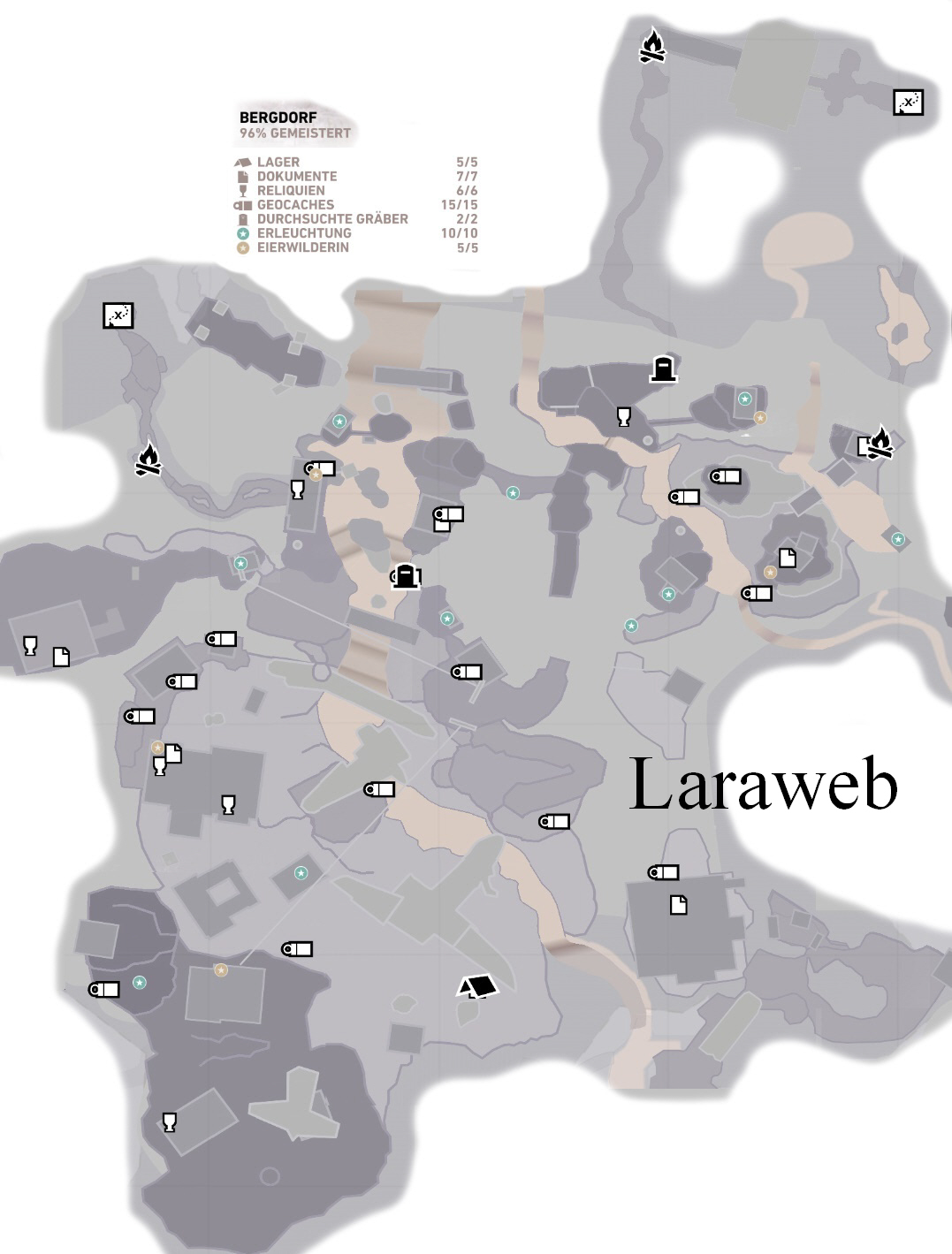 Finde den Weg zur Basis der Solari Hier habe ich gespeichert: Savegame 19 Nun mal raus aus der Höhle und ins Freie gewatschelt, wo du das Tageslager Bergabhang findest. Gehe links durch das Wasser weiter, um Statue 8/10 anzuzünden. Gehe dann im Bach hinauf bis zum Ende, wo dich der schmale Weg zwischen den Felsen zu einer kleinen Lichtung mit ein paar Wäschesäcken bringt. Zunächst holst du links um die Ecke Geocache 11/15. Unter dem kleinen Holzdach holst du Bergungsgut, und springst dann dort auf das Brett hinauf. Zünde die Schale mit den Knochen an. Jetzt gehst du zum anderen Ufer, und ziehst die brennende Schale mit einem Seilpfeil zur anderen Schale, so daß sie entzündet wird. Und du ahnst es sicher, jetzt mußt du diese Schale zum Wäschesack ziehen. Gehe dann wieder zurück zur Brücke beim Lager, und schieße links einen Seilpfeil in den Baumstamm, so daß du am Seil hinüber klettern kannst, und Geocache 12/15 findest. Trick: ich hatte hier vorher schon ein paar Kleinsparer aufgescheucht, und konnte sie jetzt von hier oben aus seelenruhig aufs Korn nehmen. Und jetzt mußt du dir ein Herz fassen, und auf den Balken über dem Weg hinauf springen, wo es weiter geht zur gelben Kiste, und Statue 9/10. Lasse dich auf den Weg hinunter, und hole die Wertsachen. Am Ende des Platzes begibst du dich mit einem Seilpfeil hinüber zur malerischen Hütte. Hier liegt gleich rechts Geocache 13/15. Öffne die Tür, und drinnen kannst du über die am Boden liegende Glocke auf den Balkon hinauf springen, wo ein Dokument liegt. Dann schießt du mit der Schrotflinte die andere Tür auf, und sammelst Zeug. Anmerkung: man könnte von der malerischen Hütte aus auch gleich nach links springen, wo der reißende Bach bzw. das Levelende kommt, wenn man es eilig hat, und keine weiteren Wertsachen sammeln will. Dort springst du auf den Felsen in Richtung Flugzeug hinüber, und du kannst dich in bewährter Technik mit der Knochenschale beschäftigen. Anschließend springst du zum Flugzeug hinüber. Hier kannst du jetzt eine Menge Zeug sammeln, das vorher noch nicht da war, einfach den Survival Instinct benutzen. Gehe durch den Flugzeugrumpf, und springe am Ende auf das vordere Flugzeugstück ab, und weiter zum Felsen, wo du rechts Geocache 14/15 findest. Weiter oben kannst du auch noch Zeug sammeln. Springe zurück zum Flugzeug, und gehe dort in das Lager Dorfplateau. Gleich daneben liegt ein Dokument. Hier machst du über das Fähigkeiten-Menü eine Schnellreise zum Lager Dorfausblick. Anmerkung: in manchen Lagern kann man eine Reise zu anderen Lagern machen, und noch was erledigen, falls nötig oder gewünscht.