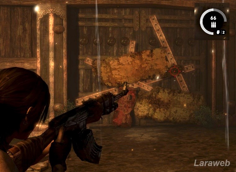 Schieße nun mit dem Gewehr eine Granate auf die "Tür" und gehe hinein. Schicke den Bauinspektoren ein paar Granaten, und erledige den Rest. Dann kannst du das Zeug sammeln, und zum Tageslager: Solarii-Festung gehen. Savegame 29 Klettere dann die Wand hinauf, und schieße am Ende mit dem Gewehr und einer Granate die Tür auf. Nun geht es hinaus, und am Seil hinunter. Dann mußt du die nächste Metalltür beseitigen, und jetzt kommt eine schwere Stelle, die Taktik erfordert! Erlege den ersten noch von oben aus mit einem Kopfschuß. Gehe auf die Terrasse hinunter und in Deckung. Erlege dort zwei oder drei weitere. Wenn erst mal keiner mehr kommt, läufst du schnell geradeaus hinüber in den Raum in der Ecke, und stellst dich so hin, daß du beide Eingänge gut im Blickfeld hast. Warte jetzt auf alle, die kommen, um sie mit der Schrotflinte zu beseitigen, die wirkt sehr gut auf kurze Distanz. Achte dabei immer auf beide Eingänge! Nach einiger Zeit dürfte keiner mehr zu dir kommen, und dann bist du hier erst mal sicher. Wenn nötig, kannst du Munition sammeln, aber Vorsicht! Gehe dann hinter der hohen Kiste gleich beim Eingang in der Ecke in Deckung, erlege ein paar, und gehe zum heilen wieder zurück. Tip: wenn du beim zielen den Survival Instinct drückst, kannst du Gegner in der Dunkelheit besser sehen! Wenn alle weg sind, gehst du hinaus, und sammelst die Wertsachen. Gehe weiter zum Brunnen, und schau dir vorher den nächsten Bereich gut an! Es gibt vor dir eine "Leiter" aus großen Brettern, und eine Seilrutsche. Laufe und springe zuerst hurtig zur Leiter, und steige hinauf. Dabei kannst du dich heilen, also keine Eile an der Leiter. Wenn du oben bist, gehst du hinter den Kisten in Deckung, und schießt relativ zügig rechts unten die drei Hairstylisten ab. Dann kannst du mit dem Seil hinunter rutschen, und in Deckung gehen. Hier mußt du in den Raum gehen, und ganz vor (!) zum "Fenster", wo du eine Granate auf das MG schießt. Anders kannst du das Ding nicht beseitigen. Danach kannst du rechts am Fenster an dem Seil hinunter rutschen, wo du nun endlich Sam triffst. Savegame 30 Anschließend kletterst du hinauf zur Seilrutsche, und fährst hinüber. Steige an der Kletterwand hinauf, drinnen läufst du schnell vor zur "Leiter", und steigst hinauf. Springe nach rechts weiter an den Kletterbalken, wo du in Sicherheit bist, und nach rechts weiter an den Kletterfelsen, wo du dich natürlich mit der Handlungstaste einhaken mußt, und klettere hinauf... Was wir hier gelernt haben: 1. Granatwerfer: ab dem 16. Level kannst du mit dem Gewehr und der alternativ Schießen-Taste Metallbarrieren zerstören. Oder auch andere Sachen wie z.B. böse Leute. Das Fadenkreuz wird rot, wenn du richtig gezielt hast, und es sich um eine zerstörbare Barriere handelt. Klicken zum vergrößern!