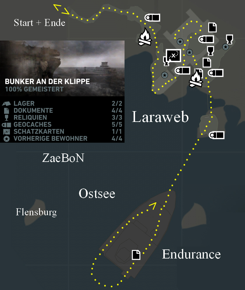 Bunker an der Klippe Watschle durch den Kriechgang zum Geocache 1/5 und zum Lager Bunkerausblick. Schieße einen Seilpfeil zu der Kletterwand am Bunker, rutsche hinüber, springe nach rechts an die Stange, und arbeite dich weiter vor, bis du oben bei dem imposanten Geschütz bist (Kanone). Zünde links den Wandteppich 1/4 an, um die Herausforderung - vorherige Bewohner zu starten. Durch den Tunnel geht es weiter, und hier kommt wieder mal ein kleines Kämpfchen. Ich glaube, du hast mittlerweile Erfahrung mit solchen unheimlichen Begegnungen der dritten Art. Wo du herein gekommen bist, liegt Geocache 2/5. Ganz hinten liegt Dokument 1/4. Savegame 42 Arbeite dich dann vorsichtig durch den Gang hinten links weiter hinauf bis ganz oben im Gebäude. An einer Wand kannst du Wandteppich 2/4 in Brand schießen. Springe dann an die hängende Kiste, hangle nach rechts um die Ecke, und ziehe dich hoch. Springe auf das Dach hinauf, und hole hinten Geocache 3/5. Wandteppich 3/4 hängt hier an einer Wand, und Teppich 4/4 ist gut versteckt oben am Pfeiler der Seilbahn. Dann kannst du dich zum LKW hinunter lassen, und zum Lager Endurance-Aussicht gehen, neben dem Dokument 2/4 liegt. Hier habe ich gespeichert: Savegame 43 Hinter den Kisten liegt Geocache 4/5, und hinten im Schuppen Reliquie 1/3, anschauen und drehen! Schieße einen Seilpfeil zur Kletterwand am Felsen und rutsche hinunter. Hier findest du hinten links Geocache 5/5. Auf der Endurance Rutsche zur Endurance (Schiff) hinunter. Gehe hinaus, in Deckung, und warte, bis der gepanzerte Typ weg ist, der eine besondere Taktik erfordert. Erlege die zwei Leichtmatrosen, und widme dich dann dem großen Klops. Wenn er nahe bei dir ist, mußt du die Ausweichen-Taste drücken, und dann die Nahkampf-Taste, wenn sie gezeigt wird. Dadurch haut Lara ihm einen Pfeil in die große Zehe. Das mag er nicht, und wuschelt sich die Haare, und jetzt kannst du ihm mit der Schrotflinte die Frisur durchkämmen. Und zwar so lange, bis die Nahkampf-Taste gezeigt wird. Laufe dann schnell zu ihm, und drücke Nahkampf, dann mußt du warten, bis wieder Nahkampf gezeigt wird, und drücken, und dann ein drittes mal auf Nahkampf warten und drücken. Achtung: immer erst drücken, wenn die gelbe Taste gezeigt wird, nicht schon vorher, wenn der rote Kreis kommt! Also du mußt ihm dreimal die Nahkampf-Taste verpassen, und wenn du das richtig gemacht und schnell genug geschafft hast, hat er keine Lust mehr und spielt nicht mehr mit. Das hat bei mir so um die vier Versuche benötigt. Jedenfalls verehrt er dir dann seinen Steigklemmenantrieb. Savegame 44 Das heißt, du kannst einen Seilpfeil auf Sachen schießen, wo ein Seil drum ist, und dann mit der Handlungstaste so lange drücken, bis Lara anzieht. Also schnell und oft. Schieße also gleich mal einen Seilpfeil links an die Kiste am Kran, und drücke die Handlungstaste, um die Kiste herzuziehen. Sie macht dann ein Loch in den Boden, und du kommst ins Schiff hinunter. Gehe dort einfach weiter, bis Lara eine (ihre?) Kabine betritt. Nimm das Dokument 3/4, und schleiche weiter. Erlege den Würstelbrater beim Ausgang, und noch einen weiteren unten am Ende der Seilrutsche, mit der du dann hinunter fährst. Gehe weiter und hinunter in den Gang voller Wasser, dort gehst du einfach weiter zum nächsten Raum, und hinüber zur elektrischen Tür. Aua! Schieße einen Seilpfeil in den Kranhaken, und ziehe ihn mit der Handlungstaste her. Springe dann zur Leitersprosse am Kranhaken hoch, so daß dieser oben in seiner Schiene weiter rutscht. Gehe nun zurück zum Eingang des Raumes, und ziehe den Haken mit einem Seilpfeil her zu dir. Springe dann an die längere Leiter am Haken, und jetzt müßtest du hinauf in die obere Etage klettern können. Watschle dort nach rechts und drücke dreimal Nahkampf. Nun ist oben das Rohr weg, und du mußt den Haken wieder dahin bringen, wo er am Anfang war, also beim Eingang. Jetzt ist der Haken wieder oben auf der Schiene, die zur elektrischen Tür führt. Ziehe den Haken zu dieser Tür, und wieder zurück. So wird Alex befreit, und die Tür geöffnet, und du gehst hinein. Nun kommt ein Video. Anschließend läufst du schnell weiter, springst an das Seil, und drückst die Handlungstaste, wenn es gezeigt wird. Savegame 45 Gehe dann einfach weiter, und du kommst zum Bug des Schiffes zurück, also wo der große Klops liegt. Springe rechts zum Kran hinauf, an das Seil, und klettere hinauf. Drücke die Handlungstaste, um den Aufstieg zu beschleunigen. Hier auf dem Felsen springst du einfach genau auf das Seil hinauf, und kletterst wieder zum Bunker.