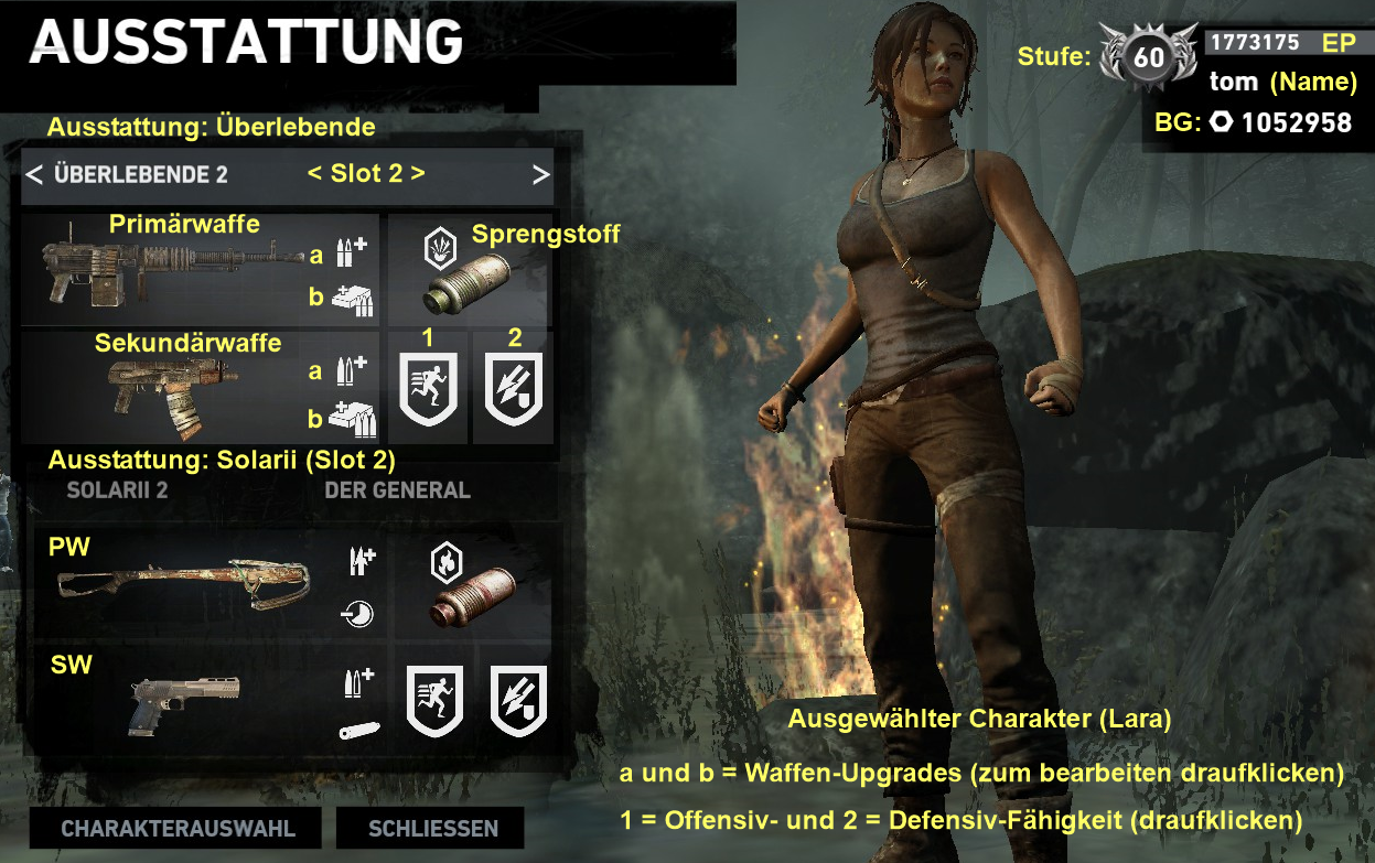 Spielen: du kannst entweder auf "Spiel finden" klicken, und dir einen Spielmodus (z.B. Team-Deathmatch) aussuchen, dort dann mit oder ohne Rangliste, und dann kommst du meist in irgend ein Spiel rein, das gerade läuft, oder es wird ein neues Spiel gestartet, wenn noch genügend weitere Spiele dazu kommen. Und du kannst auch ein privates Spiel erstellen, und deine Freunde dazu einladen. Ausstattung: man klickt auf den gewünschten Bereich, z.B. Primärwaffe oder Defensiv-Fähigkeiten, und kann dort dann alles ändern oder einstellen. Das kann man auch nicht genauer erklären, weil hier jeder die für seine Taktik passenden Einstellungen intuitiv oder experimentell herausfinden muß. Man hat für beide Seiten (Überlebende und Solarii) je 2 bis 5 (je nach Stufenrang) sogenannte "Slots", also Voreinstellungen für die Waffen und Fähigkeiten. Im Spiel kann man dann sehen, mit welcher Voreinstellung man die besseren Ergebnisse erzielt. Also das muß man selber herausfinden, welche Waffen und Fähigkeiten besser zur eigenen Strategie passen. Man kann ja nur je zwei Verbesserungen an den Waffen vornehmen, und auch nur je eine Offensiv- und Defensiv-Fähigkeit auswählen. Man sollte also in den verschiedenen Slots auch verschiedene Einstellungen vornehmen, und dann im Spiel testen, mit welcher man mehr Erfolg hat. Man kann die Slots vor dem Spiel auswählen, oder auch nachdem man getötet wurde, mit Hilfe der Handlungstaste einen anderen Slot nehmen.