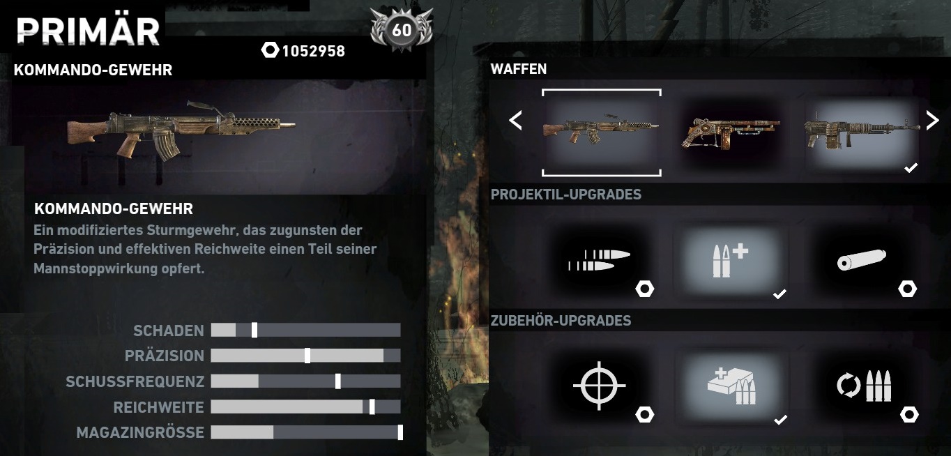 Waffen: wenn man am Ausstattungsbildschirm z.B. auf die Primärwaffe der Überlebenden klickt, sieht man diesen Bildschirm (Bild Waffe 1). Ich habe hier das leichte MG ausgewählt, und als Projektil-Upgrades die Hohlspitzgeschosse, die den Schaden erhöhen. Die Erhöhung des Schadens wird links unten bei den Balken durch den blauen Bereich angezeigt. Als Zubehör-Upgrade habe ich das erweiterte Magazin gewählt. Das wird ebenfalls als blauer Teil des Balkens angezeigt. Jetzt wird es ein bißchen kompliziert, gut aufpassen! Das leichte MG ist immer noch ausgewählt, aber ich fahre jetzt mit der Maus auf das Kommando-Gewehr (Bild Waffe 2): jetzt zeigen mir die weißen Striche in den Balken an, was das leichte MG bringt, und die Balken selber zeigen mir an, was das Kommando-Gewehr bringt. Ich kann also sofort den Unterschied sehen. Prinzipiell haben die Gewehre meist eine große Reichweite, also man kann weit entfernte Gegner treffen, aber sie erzeugen wenig Schaden, also ich muß sehr oft treffen! Bei den Pistolen ist es umgekehrt, sie haben nur kurze Reichweite, eignen sich also nur im Nahkampf, aber man muß nicht so oft treffen, da sie mehr Schaden erzeugen. Der Bogen ist eine Ausnahme: er hat eine große Reichweite, und meist ist schon ein Treffer tödlich, aber da man relativ lange braucht, bis man den Bogen wieder spannt, muß auch der erste Schuß sitzen! Wenn du also ruhig, gut und genau zielen kannst, solltest du den Bogen nehmen. Bist du nicht so der ruhige Typ, mußt du eine Waffe nehmen, die viel Munition raushaut, und grob auf die Gegner zielen. Deine Taktik richtet sich also auch nach der Wahl der Waffen bzw. umgekehrt. Mit einem MG oder Pumpgun stürmst du durch die Gegend, mit einem Bogen gehst du mehr in Deckung, und erlegst Feinde aus weiter Entfernung heraus. Natürlich kannst du auch immer schnell zwischen Primär- und Sekundärwaffe wechseln. Du kannst natürlich auch mit einem Bogen durch die Gegend stürmen, wenn du schnell und gut zielen kannst. Also man sieht schon: Die Waffe selber ist nicht so wichtig! Wichtiger ist, ob du cool bleibst, und schnell und genau treffen kannst. Eine Allzweck-Waffe, mit der du automatisch gewinnst, gibt es nicht. Auch ein Stufe 1 Spieler kann dich mit einer lumpigen Pistole raushauen... Taktik: es gibt wie gesagt keinen Ratgeber für eine "gute" Taktik. Stehst du mehr auf Angriff oder Verteidigung? Also gehst du lieber in Deckung, und wartest, bis jemand kommt, oder stürmst du wild drauf los? Beides hat Vor- und Nachteile. Und es gibt natürlich viele Arten von gemischten anderen Taktiken, die aus beiden grundsätzlichen Strategien bestehen. Das kannst du aber nur selber herausfinden. Und du mußt deine Taktik immer wechseln, denn deine Gegner finden die schneller heraus, als du denkst, und stellen sich drauf ein. Womit du sie aber auch wieder drankriegst, denn ... Aber was red ich hier. Mach dir deine Gedanken über Strategien, Gegen-Strategien, das Erkennen von Strategien, arglistige Täuschung, und so weiter... Wichtig ist vor allem, daß du immer in Bewegung bleibst, denn es gibt praktisch keinen Ort, an dem du nicht getroffen werden kannst. Von Gegnern, die du nicht mal siehst. Ein guter Bogenschütze beseitigt dich mit einem einzigen Treffer von überall aus. Und du mußt deine Augen praktisch überall haben, denn die Gegner kommen nicht nur von vorn. Wenn du beim laufen springst, bist du schwerer zu treffen. Sprinten nützt nur wenig. Diese Seite ist noch im Aufbau, und wird ergänzt, zum Bleistift mit genauen Landkarten, Videos und dergleichen... Info: Das ist ein Beispiel, wie so eine Runde im Team-Deathmatch ablaufen kann: