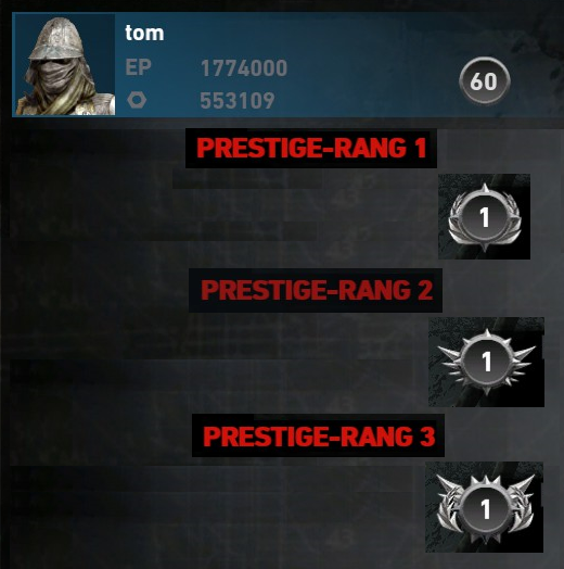 Hat man Stufe 60 erreicht, kann man den Prestige-Rang aktivieren, oder auch nicht. Wenn man ihn aktiviert, verliert man alle Waffen und Zubehör, und fängt wieder auf Stufe 1 an. Man behält nur das gesammelte Bergungsgut bzw. die Punkte, und die freigeschalteten Charaktere. Allerdings hat man wie gesagt den Rang: Prestige 1. Danach gibt es auch noch Prestige 2. Also nochmal Stufe 60 erreichen, und Prestige 3. Hier sieht man den Bildschirm mit meinem Namen, den Erfahrungspunkten EP, und darunter stehen die Bergungsgut-Punkte: 553.109. Die Zahl 60 im Kreis gibt meine Stufe an, und da es nur ein Kreis ist, ist es sozusagen Prestige 0. 60 ist die Höchststufe, und dann kann man (muß aber nicht) den Prestige-Rang 1 aktivieren. Dann fängt man wieder auf Stufe 1 an, das erkennt man daran, daß der Kreis jetzt solche Blätter hat. Wenn man dann wieder auf Stufe 60 ist, kann man Prestige 2 aktivieren, dann hat der Kreis solche Zacken. Auf der Höchststufe Prestige 3 hat der Kreis Zacken und Blätter. Es gibt leider überhaupt keine Belohnung oder irgend einen Vorteil, wenn man auf Prestige 3 wieder auf Stufe 60 kommt, also den absolut höchsten Rang erreicht hat. Dort ist dann definitiv Ende, falls das nicht noch irgendwann durch ein Update geändert wird. Wichtig: der Prestige-Rang bringt leider überhaupt keinerlei Vorteil oder Belohnung, außer daß man den Solarii-Charakter "Der General" freischalten kann!
