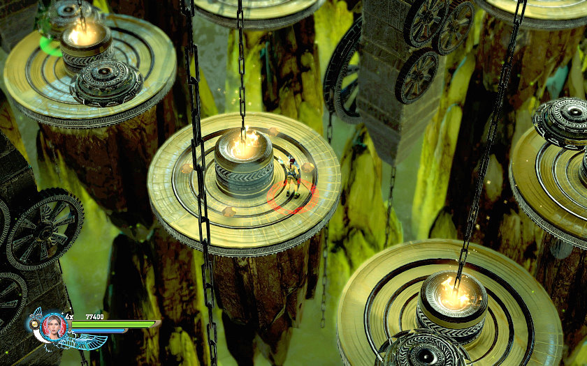 Grab des Einbalsamierers Die Zeitbombe auf die Druckplatte rollen, dann kann man weitergehen. Munitions-Upgrade: (etwas knifflig) rechts ist ein Ring zum abseilen. Werfe dein Seil an den Ring, gehe um den größeren der beiden Blöcke herum, und springe hinunter. Seile dich so weit ab, daß du gerade noch unter dem Feuer hin und her schwingen kannst, und schwinge zur Druckplatte. Das ist wie gesagt etwas schwierig, aber es geht! Dann kannst du links das Upgrade holen. Gefunden von larafan: hier mein verbesserungsvorschlag - es geht um die stelle mit dem munitions-upgrade - lege das seil erst um den großen block und dann noch um den kleinen block, dann kannst du dich gerade abseilen und die druckplatte erreichen (screenshot) - mfg larafan Klicken zum vergrößern! Anschließend geht es weiter. Sprenge die Zeitbombe hinüber, rolle sie auf die Druckplatte, und springe schnell über die Klappen hinauf. Es geht weiter über die Scheiben mit den gefährlichen rotierenden Rädern. Hier in der Gegend gibt es den Streubomben-Granatwerfer. Die nächste Aufgabe ist eigentlich klar. Bringe die Zeitbombe auf die Druckplatte, und springe schnell weiter zur Waffe auf der nächsten Druckplatte. Wähle dann einen Ring mit Bombenradius +, also daß der rote Kreis deiner Bombe größer ist, und sprenge die Zeitbombe hinauf auf die Ebene mit der Druckplatte, und hole links oben den roten Schädel 1/5. Nun geht es weiter in den nächsten Bereich, wo ein kleines Kämpfchen kommt. Es gibt hier in einer Nische den roten Schädel 2/5. Hänge dich dort an die Kante, um ihn zu nehmen. Anmerkung: am Ende dieses Bereichs hatte ich ca. 76.000 Punkte, und das reicht ziemlich locker für die Punkte-Herausforderung. Nun geht es heiter weiter zu vielen Rädern. Ziemlich links am Ende des "Räderwerks" ist der rote Schädel 3/5. Ziemlich rechts am Ende ist ein Gesundheits-Upgrade. Insgesamt gesehen muß man aber mehr oder weniger in der Mitte durch, um weiter zu kommen. Es gibt hier ein "sicheres" Rad auf halber Strecke, wo auch ein Speicherpunkt ist! Siehe Screenshot: Klicken zum vergrößern!