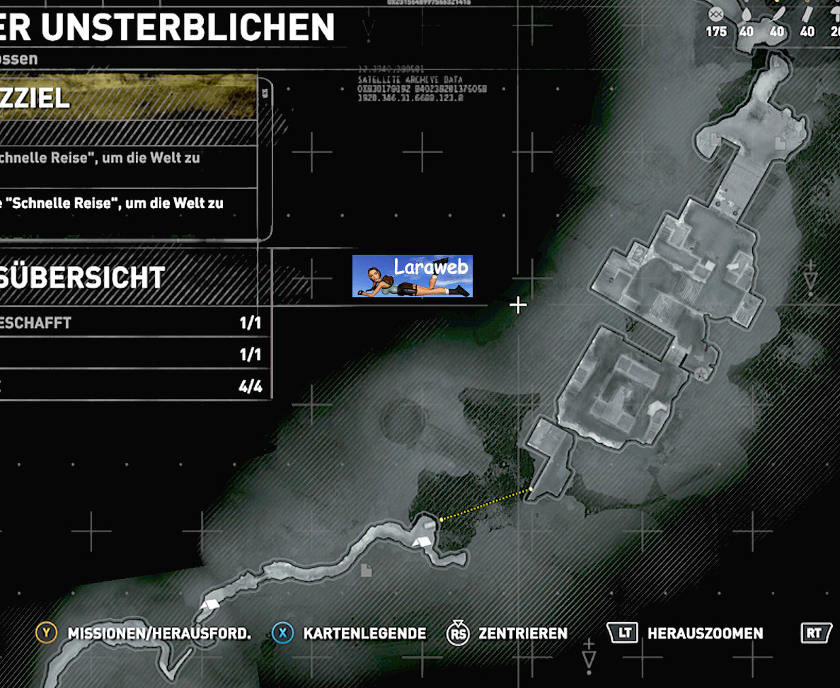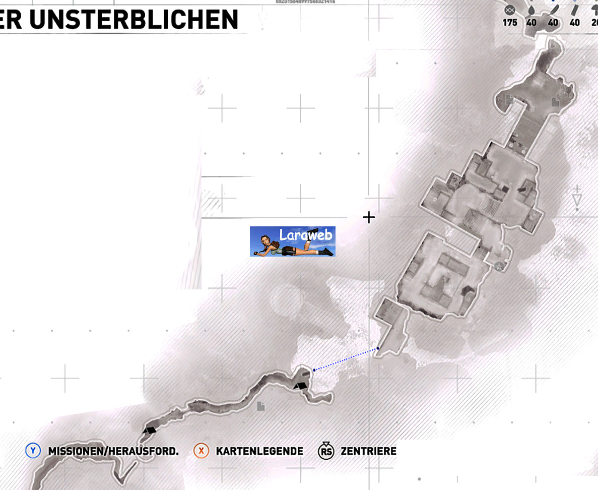 verderben. Savegame 21 = Beginn des nächsten Abschnitts (21. Slot in meinem 29 Slots enthaltenden 100% Savegame) Watschle weiter, über den Steg hinunter, und einfach an der Wand entlang vorwärts. Anschließend findest du rechts unten ein Dokument, und es geht weiter zum Basislager Vereistes Ufer. Hier sammelst du alles ein, und rutschst am Seil hinunter (festhalten!) in Weg der Unsterblichen - Die verborgene Stadt