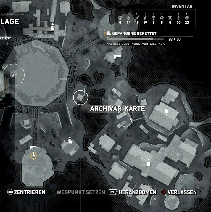 "Kalte Finsternis erwacht" Das ist das Zombie-Level. Lara ist in einer sowjetischen Station zu Gange, die von mutierten Opfern eines Experiments bevölkert wird. Du kannst hier auf deiner Karte nachschauen, und da siehst du, daß dieses Gebiet in der Mitte einen großen Turm hat, und drum herum drei etwas kleinere Türme. Also es gibt praktisch drei große Hauptgebiete. Prinzipiell mußt du nur in diese drei kleineren Türme gehen, und dort Aufgaben lösen, die du per Funk erhältst. Wenn du den Überlebens-Instinkt einschaltest, kannst du die Aufgabe nochmal oben als Text sehen. Im ersten Turm mußt du eine Aufgabe lösen, im zweiten zwei, und im dritten drei, danach kannst du in den zentralen großen Haupt-Turm schwingen, per Seilpfeil-Schwung, und dort mußt du an drei Plätzen auf die Kolben in den Rohren schießen, das leuchtet ja immer alles, wenn du den Überlebens-Instinkt einschaltest. Danach mußt du zum Hubschrauber springen, und bist fertig. Das Spiel speichert oft, also du kannst auch sterben, und dann geht es dort wieder weiter. Du kannst auch mittendrin aufhören, und später an der Stelle wieder weiter spielen. Prinzipiell mußt du wie gesagt nur in die Türme gehen, aber du kannst auch Gefangene befreien, dafür erhältst du Belohnungen. Du mußt das Spiel dazu aber immer komplett beenden, damit das mit den Gefangenen zählt. Für ca. 8 Gefangene kriegst du die zwei Goldkarten mit den "Voidhammer-Schrotflinten" Stufe I und V. Ich weiß jetzt nicht, ob man die auch im normalen Spiel benutzen kann. Für ca. 15 Gefangene erhältst du zwei Goldkarten mit dem "Uschanka-Tarnoutfit". 20 Gefangene = Wild-Pack (Karten), 30 Gefangene = Vorteils-Pack, und 40 Gefangene = Herausforderungs-Pack, weiter bin ich noch nicht. Nachtrag: 50 = Gold-Pack, dann ist anscheinend Schluß! Für 15 zerstörte Basen (also das ganze Ding 15 mal beenden) gibt es ein Kartenpack. Es gibt hier auch 8 Dokumente, die aber gut versteckt bzw. zum Teil schwer zu erreichen sind, aber es gibt oben auf einem hohen schmalen Holzturm gleich rechts unten am zentralen Hauptturm (auf der Karte gesehen) eine Schatzkarte, wodurch du alle Dokumente auf deiner Karte sehen kannst. Da führt eine lange Leiter hinauf auf dieses Türmchen. Und du kannst an mehreren Stellen verschiedene Waffen aufnehmen. Wenn du in einem der drei Türme eine Aufgabe falsch machst, kommen ein paar Zombies, danach erhältst du eine neue Aufgabe. Das ist aber alles nicht besonders schwer, nach einer Weile sollte man es kapiert haben. Hier siehst du die Archivar-Karte (Schatzkarte), und Tips für diese Aufgaben, also was das alles sein soll, und das siehst du aber auch immer, wenn du deine Karte aufrufst. Klicken zum vergrößern! Nochmal zur Wiederholung, oder falls du es noch nicht wußtest: wenn auf deiner Karte z.B. ein Dokument oder irgend was anderes eingetragen ist (Waffe, Gefangener...), und weiß ist, also du hast es noch nicht, dann kannst du auch einen Wegpunkt auf dieses Objekt setzen! Also du markierst es mit dem "Cursor", gehst also drauf, auf der Karte, und drückst dann A (am XBox-Gamepad), das müßte am PC springen sein, und dann ist das Objekt markiert! Wenn du dann im Spiel den Überlebens-Instinkt einschaltest, siehst du einen blauen Lichtkegel, so daß du das Ding leicht finden kannst! Wird (eventuell) fortgesetzt... (Bitte Geduld!) F5 drücken zum aktualisieren... Laraweb You will never walk alone... Letzte Aktualisierung: 24.08.2021 F5 drücken zum aktualisieren, um die neueste Version dieser Seite zu sehen!