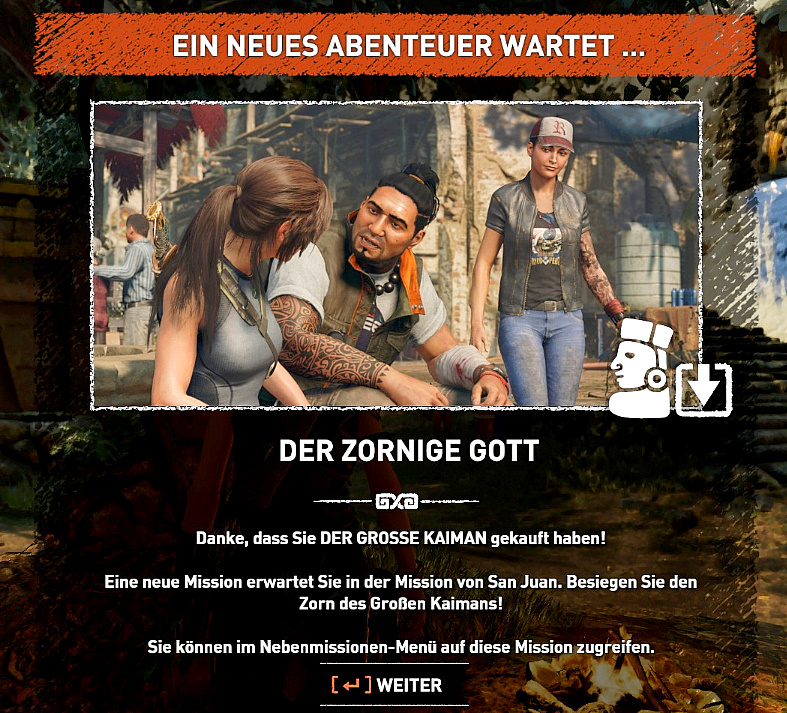 Allgemeine Hinweise: für Mission muß man nach San Juan reisen, dort hockt dann Jonah am Brunnen des Dorfplatzes, und bietet uns die Nebenmission "Der zornige Gott" an. Veröffentlicht: 29. März 2019. Klicken zum vergrößern! Also wie gesagt nach San Juan reisen, und Jonah aufsuchen, für die Nebenmission "Der zornige Gott". Da muß man dann der grünen Markierung auf der Karte folgen, dort auf dieses kleine Häuschen hinauf klettern, und per Seilpfeil hinüber auf den kleinen Hügel geseilt. Da geht es jetzt weiter. In der Höhle muß man ein bißchen herum suchen, bis man schließlich einen Generator findet, den man einschalten kann, dadurch werden die Lampen aktiv. Im Zuge dessen kann man nun bei genauer Betrachtung in einem Gang einen schmalen Mauerspalt erkennen, also da scheint das Licht durch, und da geht es nun weiter. Man findet vier Schalter, und drei davon sind natürlich tödlich. Mir hat sich die Logik dahinter leider nicht erschlossen, aber bei mir war der zweite von rechts richtig. So sollte man das Bonusgrab "Zipacnas Hunger" erreichen, und da muß man immer per Seilpfeil das störende Feuer ausschalten, und anschließend schnell weiter hoppeln. Es gibt auch runde Plattformen an einem Pendelbalken, und wenn die erste Plattform unten einen Seilwickel dran hat, muß man sie per Seilpfeil fixieren. Schließlich kommt man zu einer Stelle, wo zwei Feuer-Deaktivierungsschalter übereinander liegen, da muß man nur den unteren ziehen, und dort an die Kante springen, und schnell links weiter. Der letzte Pendelbalken, den man ebenfalls fixieren muß, also da muß man danach dann links an der Wand auf diesen schrägen Balken springen, und dort am Ende in Richtung Kletterstruktur oben an der Decke springen, und einhaken, und auf diesen kleinen Vorsprung schwingen, so kommt man schließlich oben über diesen fixierten Pendelbalken weiter hinauf, und zum Ziel. Damit wäre dieses Bonusgrab eigentlich zu Ende, aber man muß wieder hinaus aus dem Haus! Was mit Schwierigkeiten verbunden ist, denn da kommt ein zünftiges Kämpfchen! Auf Schwierigkeit Mittel speichert es zwar ca. zweimal mittendrin, aber es kommt dann ein Punkt, wo Lara meint, daß sie hier raus muß, und da sollte man zügig zu dem Bereich gehen, wo das Kletterseil hinüber auf die andere Seite führt. Dort aber erst noch alle restlichen Schurken beseitigen, und wenn Ruhe ist, hinüber hangeln. Der Rest sollte dann klar sein...