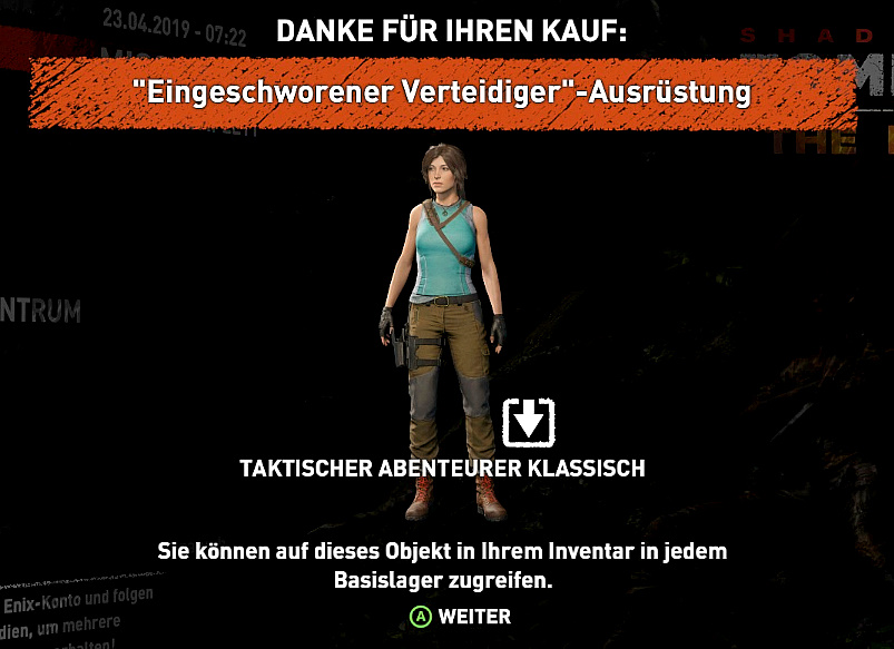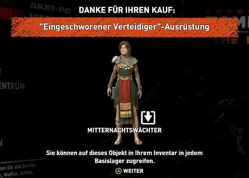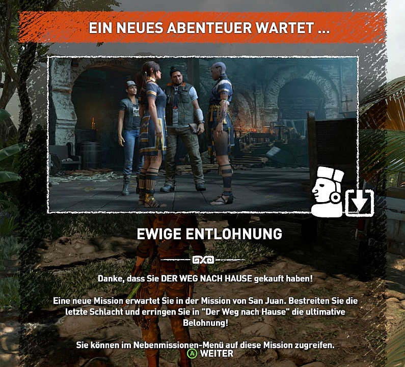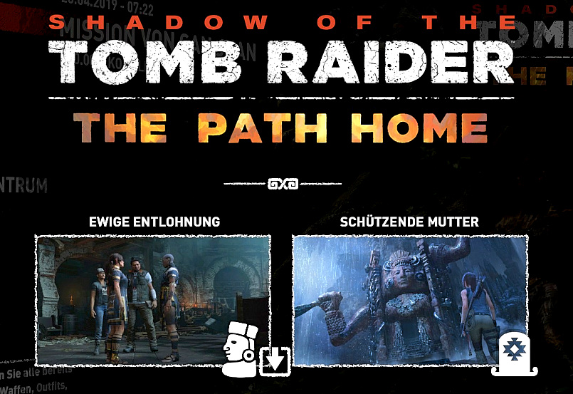 Allgemeine Hinweise: für diese Mission muß man nach San Juan reisen. Veröffentlicht: 23. April 2019. Klicken zum vergrößern! Also hierbei handelt es sich um den siebten und letzten Teil der DLC-Serie, obwohl da im Spiel im Menü der Extra-Gräber drunter noch einmal "Demnächst" steht, und fragt mich jetzt bitte nicht, warum. Ich weiß es nicht! Ich kann nur vermuten, daß da "demnächst" noch mal irgendwas kommt. Aber seid mir versichert, meine lieben Brüder und Schwestern sowie diverse, daß ich sobald als möglich ausführlichst darüber berichten werde! Und wir starten also zunächst mal wie gewohnt diese neue Nebenmission: ewige Entlohnung, wo wir im Verlauf derselben wie üblich ein paar Schergen des Scheitans bearbeiten müssen. Schließlich landen wir im eigentlichen Bonusgrab: (be-) schützende Mutter an. Da arbeiten wir uns vor, wobei es wie üblich sozusagen zwei Pfade gibt, weil man es auch zu zweit im Coop-Modus spielen kann, und wir landen in einer Halle mit einem Rätsel, und gleich mal der Hinweis, daß dieses Rätsel jedesmal anders ist, also diese drei Symbole, die man braucht, sind immer zufällig anders. Jedenfalls mußt du in dieser Halle drei Bereiche erkunden, um diese Symbole zu erhalten. Es ist im Prinzip immer gleich, was man in diesen drei Bereichen machen muß. Also erst mal an den Schalter springen (einen von den dreien, egal welcher), und schnell in die nächste Höhle gesprintet, alldieweil da eine unschöne Stachelwand von oben herunter kommt. Das erinnert stark an die klassischen Games, TR1 bis 4, wo es sowas auch schon gab. Drinnen muß man sich auf diese runde Bodenplatte (Schalter) stellen, dann kann man durch das Dornendfeld sprinten, und drüben ist wieder so eine Bodenplatte. Wenn man alleine spielt, muß man hier das Seil des Wagens durchschneiden, damit selbiger diesen Bodenschalter dauerhaft betätigt, und jetzt muß man wieder zurück auf den ersten Bodenschalter. Und Achtung! Hier muß man solange drauf bleiben, bis diese Tür ganz offen ist, und die Musik ertönt. Erst dann sollte man wieder raus. Hat man jetzt alle drei Symbole, muß man mit dem Rad in der Mitte der Haupthalle das passende Symbol nach oben in die Markierung drehen, also das Feld, wo alle diese drei Symbole drauf sind, die man gerade "freigeschaltet" hat. Wie gesagt ist das jedesmal zufällig anders! Ist man schließlich in der letzten Halle angekommen, sieht man eine große Statue, wo man die Arme und Beine richtig arrangieren muß. Das ist jetzt offensichtlich immer gleich, und auch die Ausgangsposition der Körperteile ist immer die gleiche, also das kann man sich schon mal merken, für weitere Durchgänge, also wenn man es z.B. auf Zeit spielen will. Einen entsprechenden Hinweis sieht man rechts oben bei den Schaltern, und die Hand mit der Schatulle sowie das "kleinere" Bein müssen rechts hin, Hand mit Dolch sowie "90-Grad-Bein" links. Arm oben, Bein unten, ist klar, oder? Mit dem Drehschalter in der Mitte der Halle kann man umschalten, zwischen Eingänge öffnen, und Schalter aktivieren, mit dem man Körperteile auf die andere Seite der Statue drehen kann. Damit sollte es dann klar sein, recht viel mehr muß ich dazu nicht erklären...
