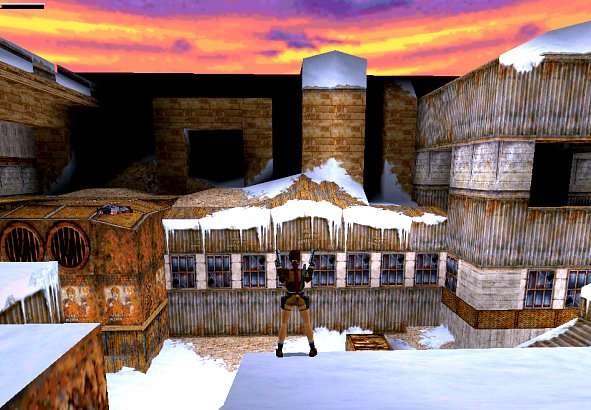 Gehe damit wieder zurück zu dem großen Eingang mit den zwei Hammer und Sichel-Zeichen und setze es neben der Tür ein. Dort drinnen ist es ziemlich dunkel, also sind Fackeln angesagt. Obendrein wohnen dort einige Ratten und ein bewaffnetes Schneemobil. Was tun? Steige schnell auf die Kiste mit Fackeln beim Eingang und erlege zwei Ratten. Dann steigst du auf die nächste Kiste rechts vorn beim Pfeiler, von wo aus du das Schneemobil beseitigst. Links vom Eingang liegt M16-Munition, hinten rechts Uzi-Magazine, und hinten links ein Medipack auf der Kiste sowie die Schlüssel-Karte 1, die du zum Schluß nimmst und auf der Kiste bleibst, bis dich eine Ratte und ein Schläger besuchen, der ein Medipack hinterläßt. Nun besteigst du das Schneemobil und fährst aus der dunklen Halle hinaus, drehst dich aber sofort um, um mit der Bordkanone auf ein weiteres Schneemobil zu feuern, das aus der dunklen Halle kommt. Dann beseitigst du vorsichtig das unten herum fahrende Schneemobil und gehst zurück in die dunkle Halle, wo du hinten rechts eine Kiste bei Seite schieben kannst, unter der Fackeln liegen. Erfolg: "Wahres Mitglied der Komsomol" = Kein Fenster einschießen, wo Hammer und Sichel drauf sind! Hier sind oben zwei Hammer und Sichel Fenster. Du darfst die nicht einschießen! Du mußt warten, bis der Typ da oben eins einschießt, der darf das! Aber schieß nachher nicht das andere kaputt! Gehe dort den Gang hinunter und stelle dich hinter den höheren Teil der rostigen Mauer, um auf der Stelle springend einen Schützen zu erlegen. Dann springst du ins Wasser hinunter und betätigst den Unterwasserhebel am Pfeiler. Anschließend gehst du dort an Land und schußbereit in den Gang, da dir hier ein Flammenwerfer (Nummer 3) (mit Medipack) begegnet. Am Ende des Gangs liegen Fackeln. Gehe zurück zum Wasser und springe mit Anlauf/Griff an die Sprossenwand, um nach oben zu klettern. Dort ziehst du die Kiste vor, unter der Granaten liegen. Dadurch öffnet sich gegenüber eine weitere Tür mit Granaten und dadurch schließlich hinter der Kiste noch eine Tür mit dem Granatwerfer. Anschließend springst du ins Wasser und tauchst hinter den abgeschalteten Propeller, wo es zweimal rechts und einmal links geht, bis du auftauchen kannst und am Grund zweimal Munition findest. Hier gehst du auf dem Steg an Land, erlegst eine Maus und findest weitere Munition. Nun schwimmst du zur anderen Seite und verläßt den Gang durch die automatische Tür. Dahinter geht es nach links zurück in den großen Hof, wo du am anderen Ende die Schlüssel-Karte in den gelben Stern neben der Tür einsetzt. Dahinter nimmst du eine zweite Schlüssel-Karte auf, läufst aber sofort wieder hinaus, um einen Schläger zu erlegen, der ein Medipack hinterläßt. In dem Raum, aus dem er kam, findest du einen Kasten mit einem roten Stern (dazu später) und einen Schalter (drücken). Jetzt steht im vorherigen Raum ein Schütze herum, den du auf der Stelle springend erlegst. Er hat die benötigte Schlüssel-Karte 2 mit dem roten Stern dabei. Vorher geht es aber noch zurück zu einem Geheimnis. Gehe wieder hinaus in den großen Hof und gleich links in das (bekannte) Gebäude, wo du links in den Gang mit den Stalin-Bildern gehst und dort rechts weiter. So kommst du zu einer breiten Rampe. Steige/gehe hinauf und drücke rechts den Schalter, laufe aber gleich wieder hinunter, um drei Hunde zu erlegen. Oben findest du Geheimnis 2 (Gold-Barren). Jetzt geht es zurück zu der Tür mit dem roten Stern, wo du die Schlüssel-Karte einsetzt und dann den Schalter drückst, um die äußere Tür zu öffnen, durch die du schnell läufst, da sie zeitgesteuert ist. Nun gehst du nach draußen und kriegst Besuch von zwei Prügelknaben. Dort kletterst du links in der Ecke die verschneite Felswand hinauf und springst auf den rostigen Träger mit den Fackeln. Wenn du den nächsten Querträger betrittst, kommen rechts von den Kisten zwei Schützen. Da helfen nur schwere Waffen und seitlich hin und her springen (oder du lockst sie an und läufst schnell wieder hinunter, um sie von unten aus zu erlegen). Nun ziehst du die bewegliche Kiste neben der Wand hervor und gehst auf ihre andere Seite. Danach steigst du aber schnell auf die Kiste (hochspringen und greifen), um zwei Hunde zu beseitigen, anschließend schiebst du sie noch einmal. Jetzt kannst du die andere Kiste ziehen und findest darunter Munition. Nun holst du das Medipack auf der Kiste und wartest, bis ein Schläger herauf kommt, der ein Medipack hinterläßt. Von hier aus kannst du auch den Schützen auf der anderen Seite erlegen. Dann läßt du dich zu dem toten Schützen herab und findest bei ihm Uzi-Magazine. Nun gehst du zur Grube und springst auf den rostigen Block, wo du einen Schläger und eine Krähe erlegst. Anschließend geht es hinauf auf den anderen rostigen Block zu Munition.