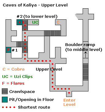 In diesem Level gibt es einen kurzen und einen langen, gefährlichen Weg. Der gefährliche Weg bringt zusätzlich nur ein kleines Medipack sowie etwas Gewehrmunition ein, außerdem sind keine Geheimnisse versteckt. SG0 Den kurzen Weg natürlich nur nehmen, wenn man es eilig hat, oder die Erfolge schon hat, oder nicht will. Karte des Labyrinths siehe unten! Kurzer Weg: gehe nach links und folge dem Gang bis zur Kreuzung, an der du links abbiegst und dich immer links hältst, bis du eine Grube findest, in die du dich bis ganz unten (zwei mal) herabläßt und Fackeln findest. Klettere wieder nach oben und folge dem Gang weiter, also nach links, wo gleich rechts um die Ecke ein Kriechtunnel ist, in dem du nach links kriechst und dann gleich in den nächsten Kriechtunnel direkt vor dir. Hier kriechst du nach rechts zu Uzi-Munition, dann geradeaus rückwärts und läßt dich vorsichtig in die Grube hinab. Dort folgst du dem Gang bis zum nächsten Kriechtunnel, in dem du nach links abbiegst und dann immer an der rechten Wand entlang marschierst, bis du in einer Kammer mit dem grünen Kristall 1 landest... (siehe nächster Absatz) Langer Weg: Oberste Ebene - Upper Level (bei Stella) Hierbei ist es äußerst ratsam, sich eine Skizze (siehe unten oder bei Stella) anzufertigen, denn du mußt wie beim kurzen Weg die Fackeln und die Uzi-Munition holen. Dann darfst du dich aber nicht in die Grube bei der Uzi-Munition herablassen, sondern mußt wieder zum Beginn des Levels zurückkehren, was fast nur mit Karte funktioniert. Und du mußt noch die Schlange 1 erlegen, das ist auf der Karte von Stella das C = Cobra. Dann geht es vom Startpunkt aus (Enter Level) in den anderen Gang, wo du nach etwas kriechen eine große Schräge findest. Nun kommt der gefährliche Teil: laufe hinunter und spurte nach links in den Gang. Hier gehst du rückwärts die Schräge hinauf und läufst beim Ertönen des Kugelgeräuschs in die erste Nische links. Zweite Ebene - Second Level (bei Stella) Dann geht es die Schräge hinauf und durch einen Kriechgang. Links ist eine Sackgasse mit Schlange 2. Zurück und nach dem Kriechgang rechts gehen (schau einfach auf die Karte), wo du im ersten Gang rechts Munition findest und im anderen Gang das Medipack sowie die Schlange 3. Hier findest du (in der Nähe) auch einen Block (movable block), den du einmal schiebst und so in dem Gang rechts schließlich eine Grube erreichst, in die du dich herabläßt. Dritte Ebene - Third Level (bei Stella) Du kommst auf der Karte von Stella links oben bei dem Punkt: Pit # 3 heraus. Navigiere jetzt mittels Stellas Karte zu Schlange 4 und dann nach rechts oben zu dem Punkt Pit # 4, das ist die Kammer mit dem grünen Kristall 1... Unterste Ebene - Lowest Level (bei Stella) Kammer mit grünem Kristall 1: SG1 nimm die Fackeln und springe über die Grube, um den Kristall zu ergattern. Werfe dann von der Wand aus eine frische Fackel hinunter (zweimal Komma) und betrachte dir die Lage. Unten liegen vier Schlangen in den Ecken. Lasse dich hinunter und gehe sofort einen Schritt zurück in die Mitte. Von hier aus kannst du die ersten vier Tierchen erlegen. Nachdem du mit einer weiteren Fackel die Lage erkundet hast, springst du von der Wand her in die Rollbahn der Kugel Richtung Ausgang und gleich wieder zurück an die Wand. Vor dem Ausgang dösen übrigens 6 weitere Schlangen. SG2 Gehe und krieche bis zur nächsten Rampe mit Kristall 2 und Medipack davor. Ziehe schwere Waffen und rutsche hinunter... SG3