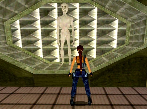 Die neuen TR 3 Remastered Erfolge, die man hier (in diesem Level) kriegen kann, stehen nun in der folgenden Lösung, die restlichen Erfolge stehen hier. F5 drücken zum Aktualisieren dieser Seite, die letzte Aktualisierung (Datum) steht rechts unten. Zeitspiel: Speedrun (Level möglichst schnell abschließen) Tomb Raider Remastered Steuerung. Worum geht's? In der sagenumwobenen Area 51 entdeckst du Aliens und ein UFO, in dem das gesuchte Artefakt liegt... Ja, die UFOs und die Außerirdischen... Es ist räumlich UND zeitlich absolut unmöglich, daß hier UFOs rumfliegen, geschweige denn Außerirdische rumlaufen. Das Universum ist so groß, das kannst du dir gar nicht vorstellen, und es kann von mir aus gerne sein, daß da irgendwo Lebewesen sind, die sowas wie Raumschiffe bauen könnten, aber die müßten so weit weg sein, daß sie unmöglich bis zu uns kommen können, sonst hätten wir sie mit unseren mittlerweile hervorragenden Teleskopen und Antennen bereits entdeckt. Und wenn jetzt jemand sagt, ach Quatsch, die können alles! Dann benutzen die bestimmt nicht so lächerliche fliegende Untertassen, wie wir uns das immer vorstellen. Und dann kommt noch das zeitliche Problem dazu. Wir Menschen neigen dazu, uns für die Krone der Schöpfung zu halten, den Mittelpunkt des Universums. Dabei ist es gerade mal so um die 200 Jahre her, daß wir die erste Lokomotive erfunden haben. Das ist absolut völlig gar nichts im Vergleich zum Alter des Universums mit ca. 13 Milliarden Jahren! Eine Milliarde sind 1000 Millionen! Irgendwelche anderen höher entwickelten Lebewesen so wie der Mensch würden irgendwo anders im Universum auch nicht länger als ein paar Hundert Jahre leben, bis sie sich gegenseitig umgebracht oder alle ihre Rohstoffe aufgebraucht haben. Also auch exakt Null Jahre im Vergleich zu 13 Milliarden. Und warum sollten sie gerade ausgerechnet jetzt zu uns kommen? Also dieser Zufall ist mathematisch Null! Absolut unmöglich! Eventuell gab es viele höher entwickelte Lebewesen im Universum, die Betonung liegt auf gab! Und es wird eventuell noch viele höher entwickelte Lebewesen geben! In der Zukunft! Aber daß einige davon gerade jetzt zu uns kommen, kannste knicken... Wir Gehirnakrobaten meinen, daß es jetzt bei uns auf der Erde Raumschiffe gibt, heißt, daß es nun im gesamten Universum ebenfalls "Menschen" mit Raumschiffen gibt! Und die sind mit einem Fingerschnipp hier! Lach-Smilie! Die gab es vielleicht vor einer Milliarde Jahren, oder es wird sie in einer Milliarde Jahren geben, aber nicht jetzt! Also die Entwicklung hier auf der Erde läuft zeitlich absolut simultan (gleichzeitig) im gesamten Universum ab! Und die sind dann auch in 5 Minuten hier! Zum totlachen... Ja ich weiß, ist ein bißchen schwierig zu verstehen, frag einfach mal deinen Physiklehrer*in... Erfolg: "Limbo-Meister" = Lass nicht zu, dass dich ein Lasergeschützturm ins Visier nimmt - aber schalte sie auch nicht aus. Wenn ich das richtig verstanden habe, geht es nur darum, daß du keinen von den Laserstrahlen "berührst". Und es ploppt erst am Ende dieses Levels auf. Wenn du einen Laserstrahl berührst, leuchtet kurz (oder länger) der Gesundheitsbalken auf (oder es geht irgend ein Alarm los, oder ähnliches), dann neu laden, und nochmal probieren! Erfolg: "Die Schnellen und die Toten" = Lass nicht zu, dass die Wachen die Handscanner betätigen. Einer war im letzten Level, der Rest ist hier. Der Erfolg müßte nach dem letzten Handscanner aufploppen. SG0 Gleich links hinter der ersten Kiste wartet ein Medipack. Gehe wieder zurück, locke die Wache zu dir und erlege sie mit der Desert Eagle, bevor sie zurückläuft und Alarm auslöst (Handscanner). Sonst würde gegenüber die Waffenkammer mit Laserstrahlen gesichert, in der du die MP 5 mit entsprechender Munition holen kannst. In diesem Fall würde ich von vorn beginnen. Den Schalter in der Waffenkammer lassen wir in Frieden. Wieder draußen am Gang öffnest du das Gitter und kriechst weiter zu dem Medipack. Dann geht es in die nächste Öffnung, wo du unter den Laser kriechst und im richtigen Moment nach links. Hier wartet im dunklen ein großes Medipack. Krieche wieder zurück in die Mitte und laufe bei passender Gelegenheit zur Leiter, die du schnell nach oben kletterst. Hinweis: im folgenden Gang ist rechts ein Handscanner. Du mußt die Wache am besten mit der Desert Eagle erlegen, bevor sie da draufpatschen kann, wegen dem Erfolg, und falls du es nicht schaffst, sind im Gang rote Laserstrahlen! Krieche weiter in den Gang (Handscanner), erlege die Wache und drücke den Schalter, um einen Gefangenen zu befreien, der ein Medipack in der Zelle hat. Im Gang ist eine Laserfalle. Es gibt einen Trick, wie du solche Strahlen besser sehen kannst: drücke Esc, gehe auf Statistik und wähle die Sonnenbrille (Detailstufen). Stelle dort den Gamma-Wert auf 2 oder 3. Anschließend mußt du natürlich wieder einen vernünftigen Wert einstellen. Krieche unter der Falle hindurch und nach rechts in die Nische zu Fackeln. Dann geht es dort weiter in den nächsten Gang, wo links eine Kanone lauert, die durch den Laserstrahl ausgelöst wird, oder wenn du auf sie schießt, aber glaube mir, du ziehst den kürzeren. Gehe also geradeaus weiter und krieche links um die Ecke und bis vor die niedrige Kiste. Beachte mit der Umschauen-Taste die geöffnete Tür rechts dahinter, die von der Wache geschlossen wird, sobald sie dich bemerkt (Handscanner). Stehe also auf, springe über die Kiste und laufe schnell in die Tür, die sich hinter dir schließt. Jetzt kannst du wertvolle Munition sammeln und die Wache durch die geschlossene (!) Tür erlegen. Der Schalter bringt dich wieder nach draußen, SG1 wo du am Ende des Ganges den Knopf drückst und hinunterfällst. Krieche vorsichtig zu dem Steg, wo die Wache patrouilliert, bleibe unten und ziehe die Desert Eagle. Wie du siehst, zielt Lara unbemerkt durch den Steg hindurch auf die Wache. Schicke ihr drei Kugeln, um sie daran zu hindern, Alarm zu