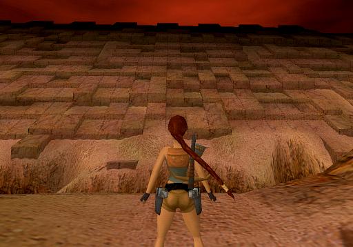 Die neuen TR 4 Remastered Erfolge, die man hier (in diesem Level) kriegen kann, stehen nun in der folgenden Lösung, die restlichen Erfolge stehen hier. Tomb Raider Remastered Steuerung. Worum geht’s? Kurz gesagt: die große Pyramide hinauf und auf ihrer linken (westlichen) Seite wieder nach unten. SG7 Ziehe dich am Ende des Gangs nach oben, nimm das Medipack und die Munition. Dann zerlegst du die Tür, gehst hinaus, um einen Schurken anzulocken und springst wieder zurück, um ihn von drinnen aus seitlich springend zu erlegen. Draußen beseitigst du den links stehenden Kollegen und springst mit Anlauf nach links (Süden) über die Grube, wo du schnell zum Eingang und somit in Deckung läufst. Von hier aus beseitigst du den Schützen gegenüber und öffnest die Tür. Dahinter „triffst“ du zuerst einen Schützen und drinnen zusätzlich noch einen großen Käfer. In der Mitte des Raums liegt wieder einmal eine unsichtbare Falltür, die du mit einer Fackel besser erkennen kannst. Unten liegt Geheimnis 1 (68/70) in Form des Granatwerfers bzw. Munition. Zerlege nun den Holzverschlag und öffne das nächste Gebäude, in dem ein weiterer Schurke wartet. Die Falltür dort enthält keinerlei Wertsachen. Gehe lieber hinaus und zerlege beim nächsten Gebäude den Eingang mit dem „Danger-Schild“. Drinnen findest du einige große Käfer, Granaten, Uzi-Magazine und eine Falltür mit Medipack. Anmerkung: was jetzt kommt, ist schwer zu beschreiben, nämlich das Rumgehüpfe auf der Pyramide. Ich habe es jetzt (2015) nochmal überprüft und korrigiert bzw. verbessert, und man sollte damit eigentlich durchkommen. Zur Not habe ich ja noch Savegames hinzugefügt, und es gibt ja auch noch die Videos. SG8 Jetzt mußt du auf die Pyramide klettern. Das Ziel liegt links oben, du mußt aber zunächst zur rechten Seite und dann hinauf. Außerdem triffst du auf einige Käfer sowie herabfallende Steine (schaue dir die Pyramide vorher gut an und mache hier ein Extra-Savegame, um dir später noch mal alles in Ruhe anschauen zu können). Springe zuerst von dem Vorsprung aus mit Anlauf zur anderen Seite (Pyramide). Dort gehst du nach links (Westen), rutschst die Rampe hinab und springst mit Anlauf/Griff weiter. Steige ein Stück höher und erlege oben den Käfer (entweder mit dem Gewehr oder Pistolen und ständig Rollen machen). Hier steigst du hinauf, bis du auf der zweiten durchgehenden Ebene der Pyramide bist. Springe dort einen Schritt vor der Schräge nach rechts (Osten) weiter auf das flache Stück derselben Ebene, laufe dort schnell hoch vor den großen Block der nächsthöheren Ebene und ducke dich, um nicht von einem Stein getroffen zu werden. Nun springst du aus dem Stand nach rechts weiter und dann noch einmal, wo du dich wieder duckst (Stein von oben). Steige dort einen Block nach oben, so daß du auf der dritten Ebene ist. Dort springst du aus dem Stand wieder zweimal nach rechts (Osten) auf die zwei Block breite, flache Schräge.